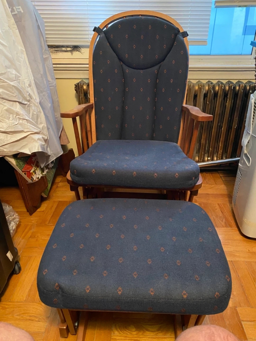 25Selling a comfy glider rocking chair with an ottoman. It's perfect for relaxing and unwinding after a long day. The chair and ottoman have a nice blue patterned fabric and a sturdy wooden frame. It's in good condition and ready for a new home!