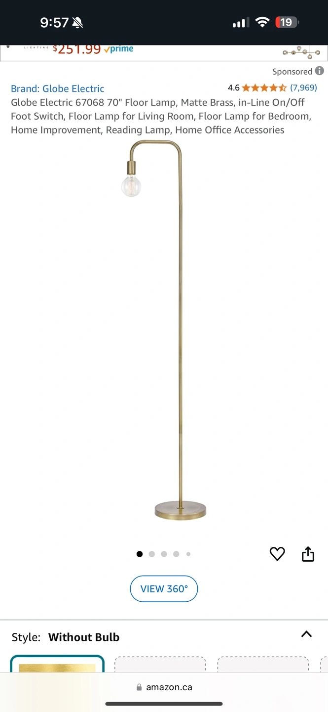Floor lamp with a matte brass finish. Includes foot switch. 70 inches tall. Retails at $55