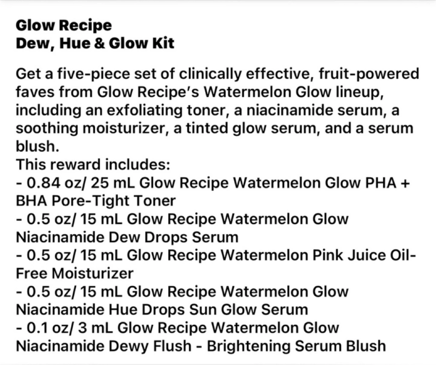 30Selling a Glow Recipe Dew, Hue & Glow Kit! It includes a five-piece set of clinically effective, fruit-powered favourites from Glow Recipe's Watermelon Glow lineup, including an exfoliating toner, a niacinamide serum, a soothing moisturizer, a tinted glow serum, and a serum blush. This reward includes: - 0.84 oz/ 25 mL Glow Recipe Watermelon Glow PHA + BHA Pore-Tight Toner - 0.5 oz/ 15 mL Glow Recipe Watermelon Glow Niacinamide Dew Drops Serum - 0.5 oz/ 15 mL Glow Recipe Watermelon Pink Juice Oil-Free Moisturizer - 0.5 oz/ 15 mL Glow Recipe Watermelon Glow Niacinamide Hue Drops Sun Glow Serum - 0.1 oz/ 3 mL Glow Recipe Watermelon Glow Niacinamide Dewy Flush - Brightening Serum Blush Pickup near the well or meet at Eaton on Tuesday and Thursday