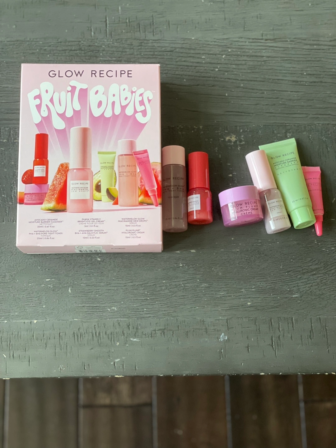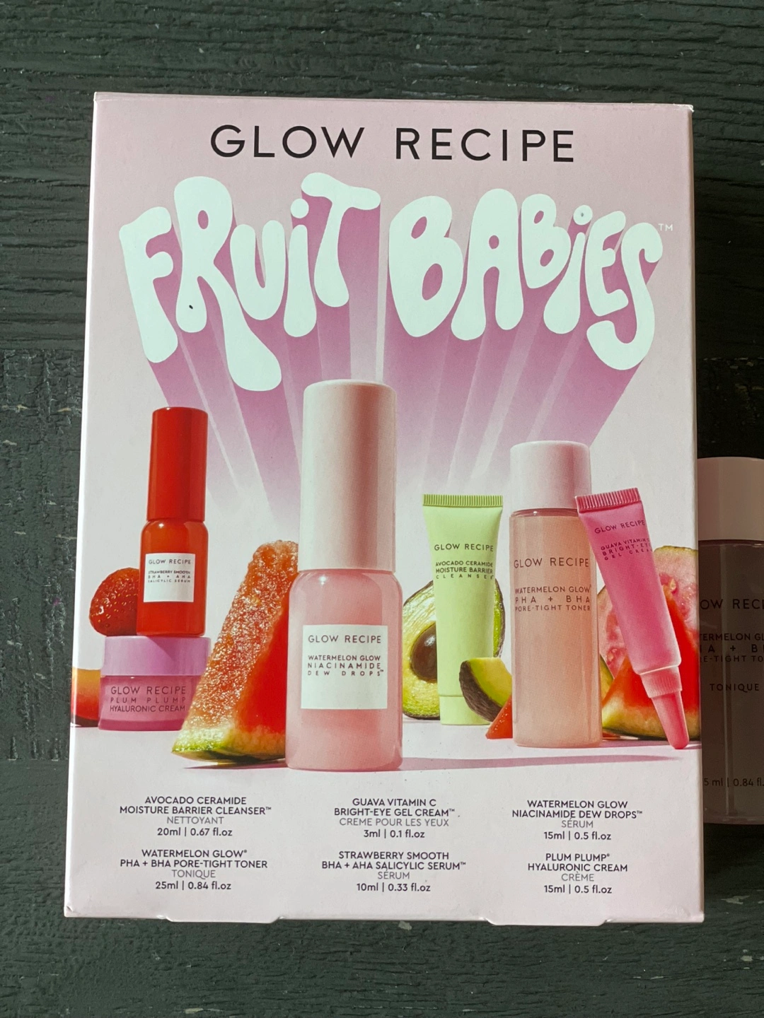 Brand new Glow Recipe Fruit Babies kit! This set includes a variety of mini-sized skincare products to try out: - Avocado Ceramide Moisture Barrier Cleanser 20ml - Guava Vitamin C Bright-Eye Gel Cream 5ml - Watermelon Glow PHA + BHA Pore-Tight Toner 25ml - Strawberry Smooth BHA + AHA Salicylic Serum 10ml - Watermelon Glow Niacinamide Dew Drops 15ml - Plum Plump Hyaluronic Cream 15ml Perfect for travel or trying out new products
