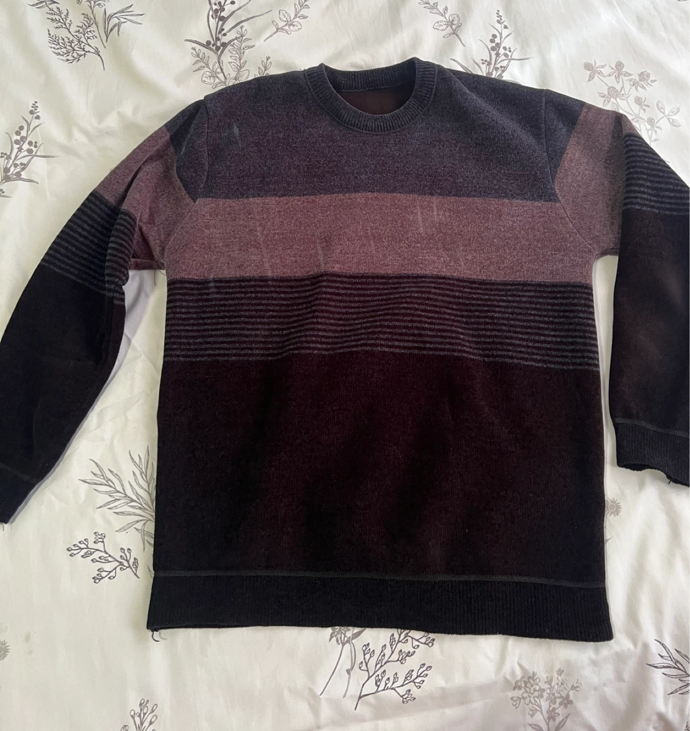 Men's long sleeve crew neck sweater. Features horizontal stripes in maroon, grey, and black. Made from a soft knit material. Perfect for casual wear or layering! M size