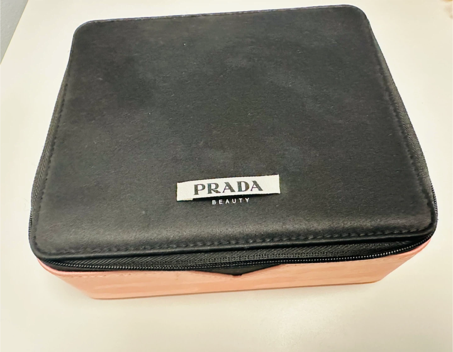 This is a Prada Beauty cosmetic case. It's black and pink with a zippered closure. Interior is lined and black.
