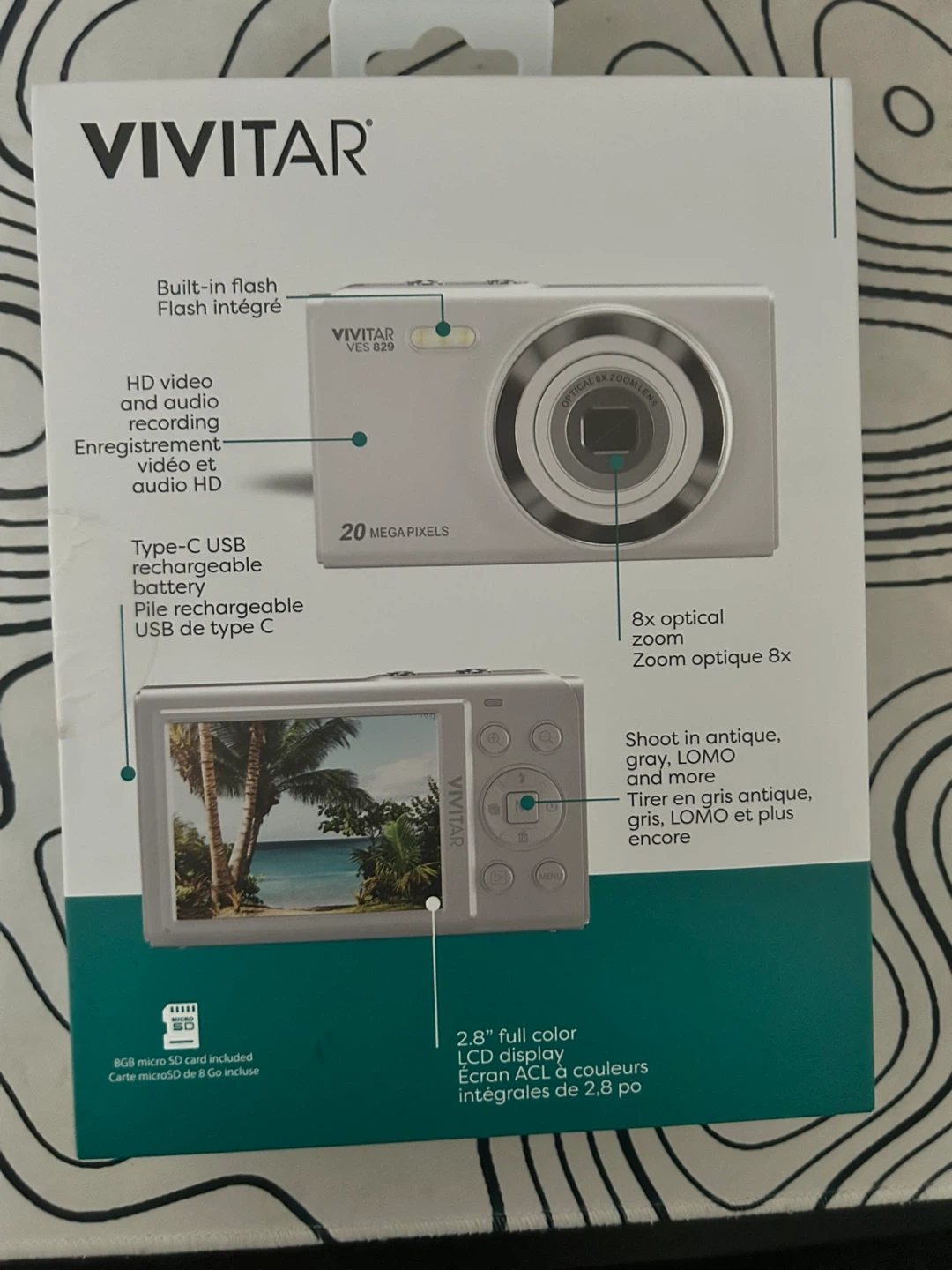 This is a Vivitar 20 megapixel digital camera with 8x optical zoom. It features HD video and audio recording, a built-in flash, and a 2.8" full-colour LCD display. It also includes a Type-C rechargeable battery
