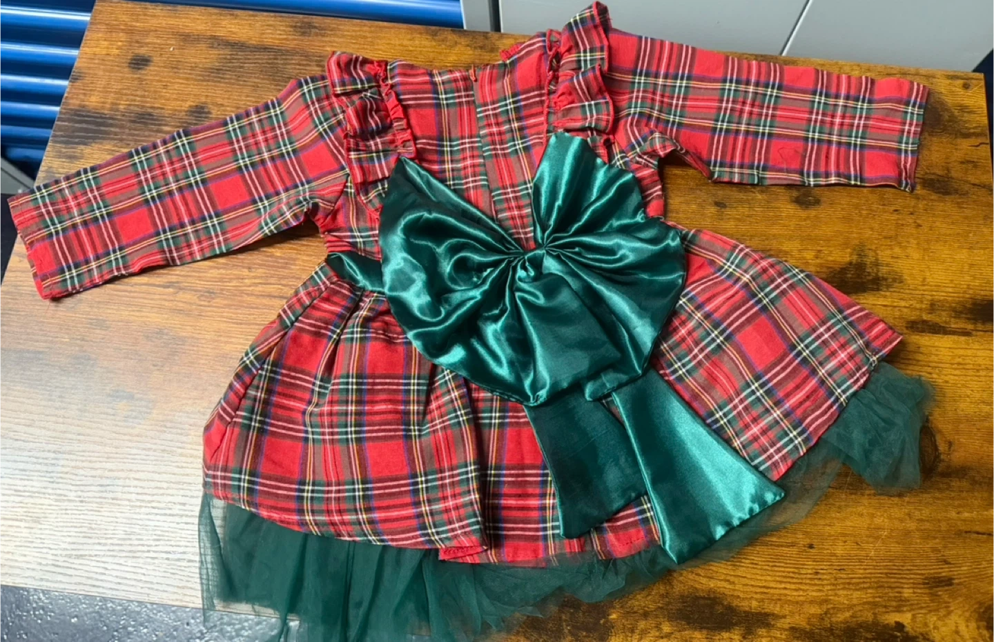 This festive toddler girls dress features a red and green plaid pattern. It has long sleeves and a large satin bow on the front. The skirt has a layered green tulle underskirt for fullness. Perfect for holiday events!