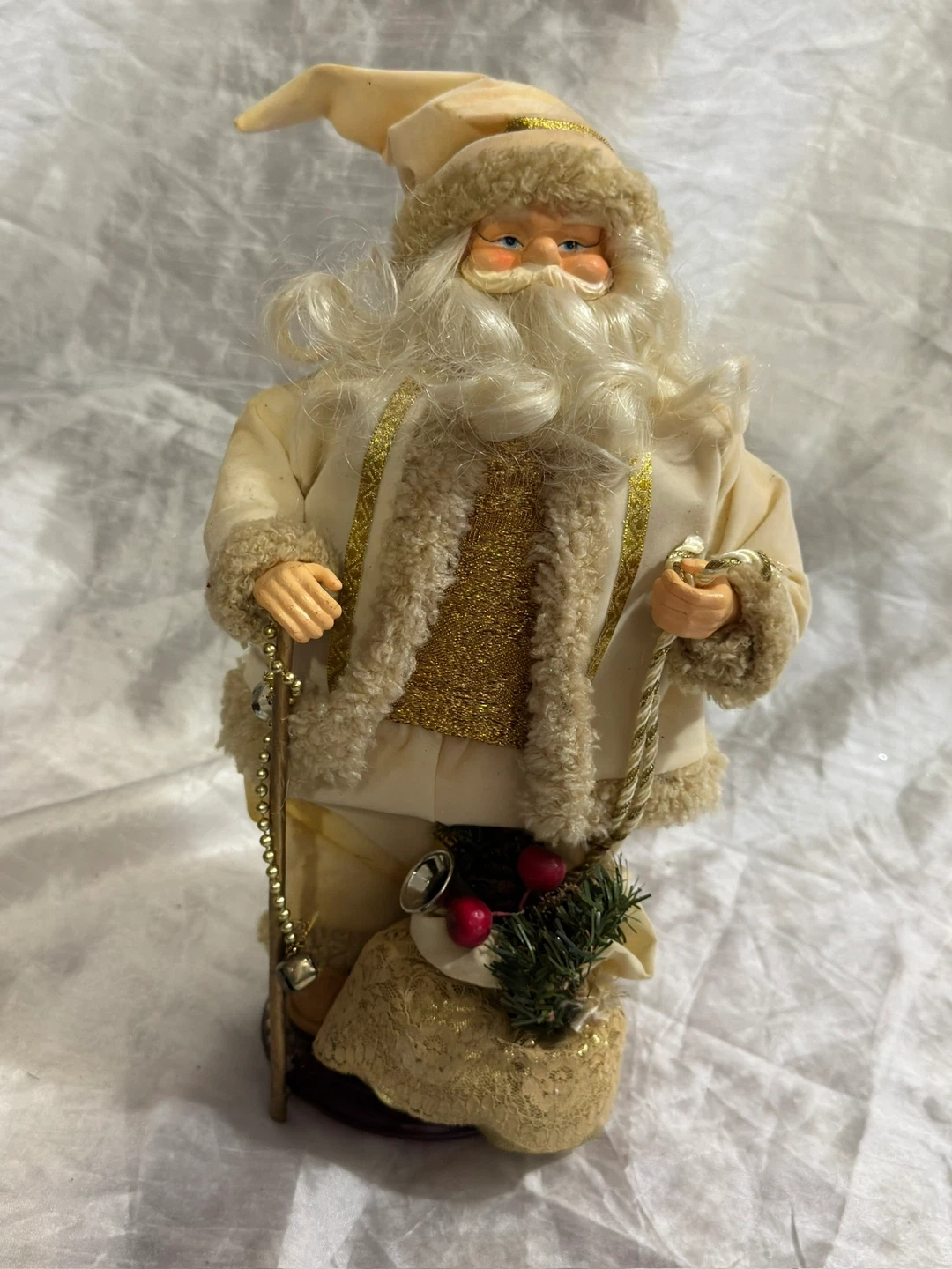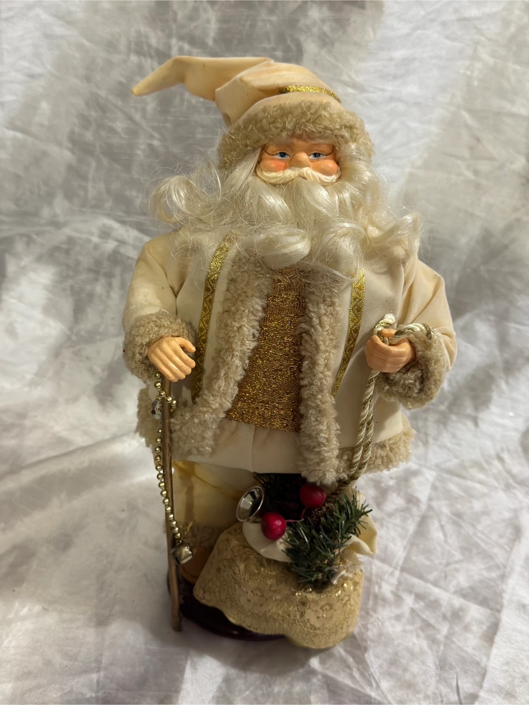This festive Santa Claus figurine is dressed in a cream-coloured outfit with gold accents and faux fur trim. It's holding a sack filled with goodies and a staff. Perfect for adding a touch of holiday cheer to your home!