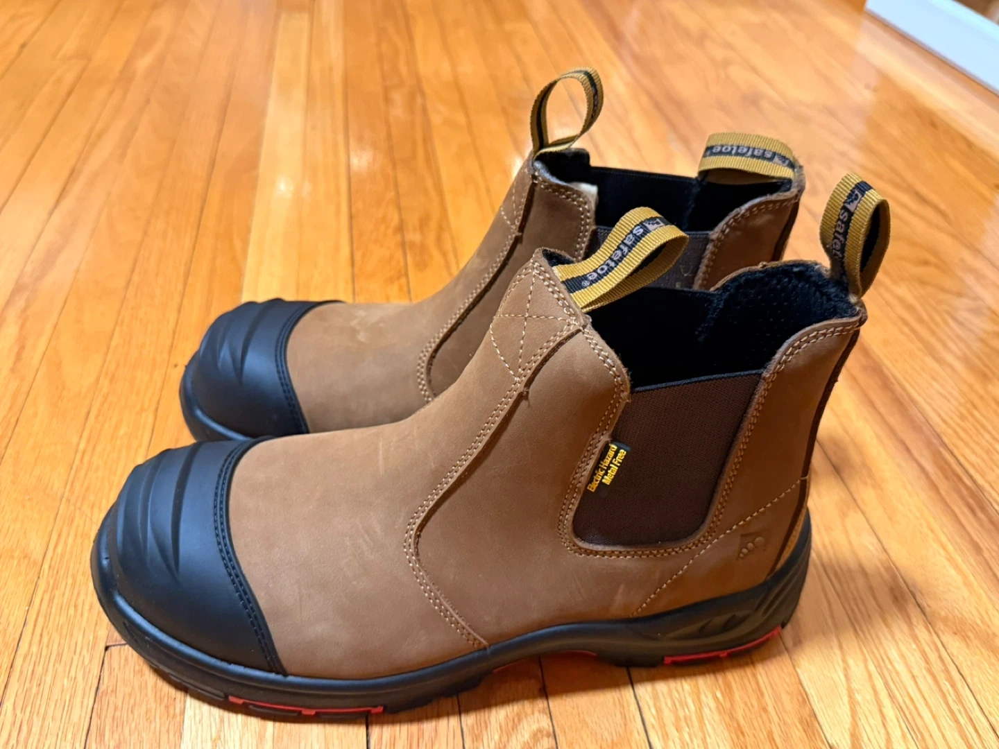 These Safetoe work boots are made with brown suede and feature a black steel toe cap. They have a slip-resistant rubber sole. Perfect for demanding work environments!