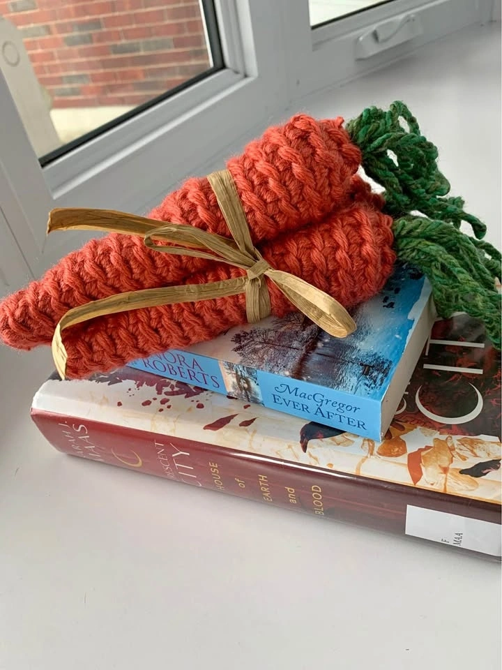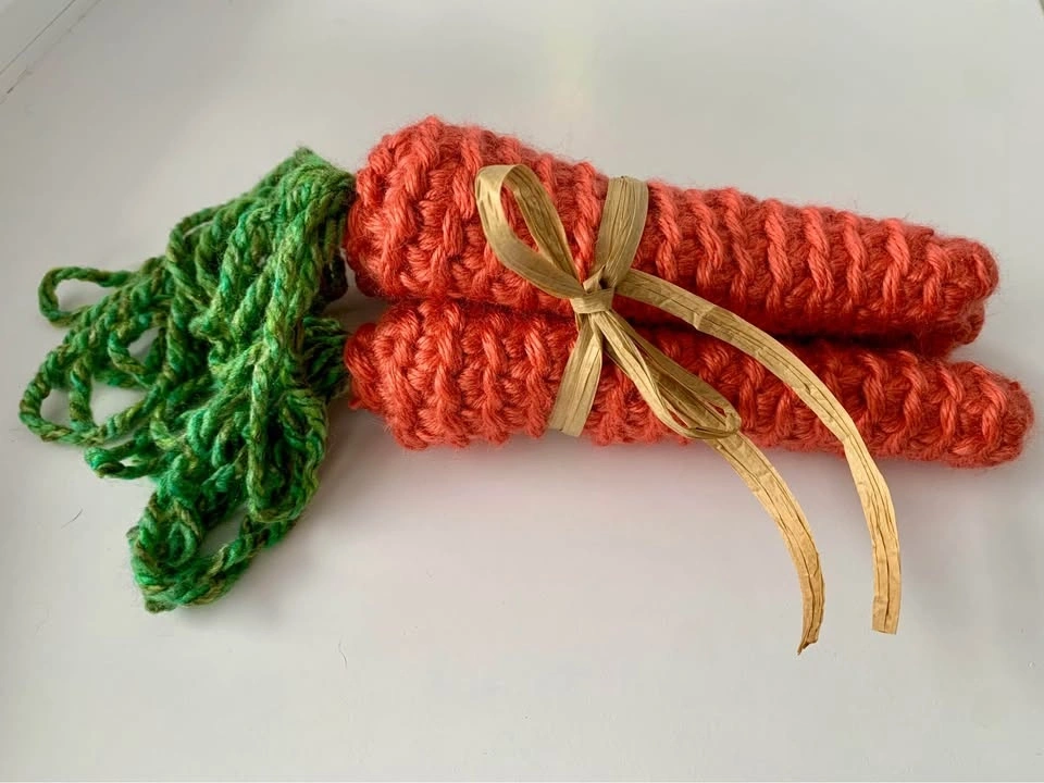 Lightweight bundle of three handmade carrots, bundled together with paper ribbon for a farmhouse look.
