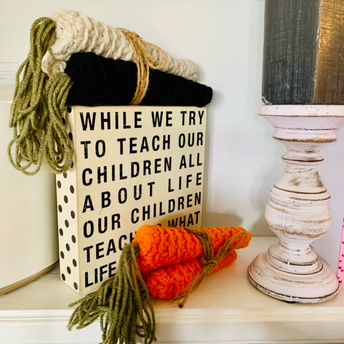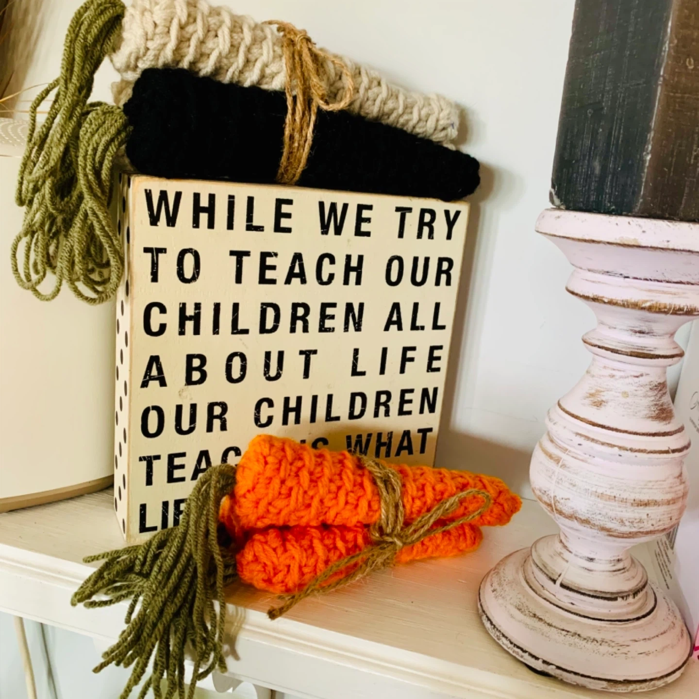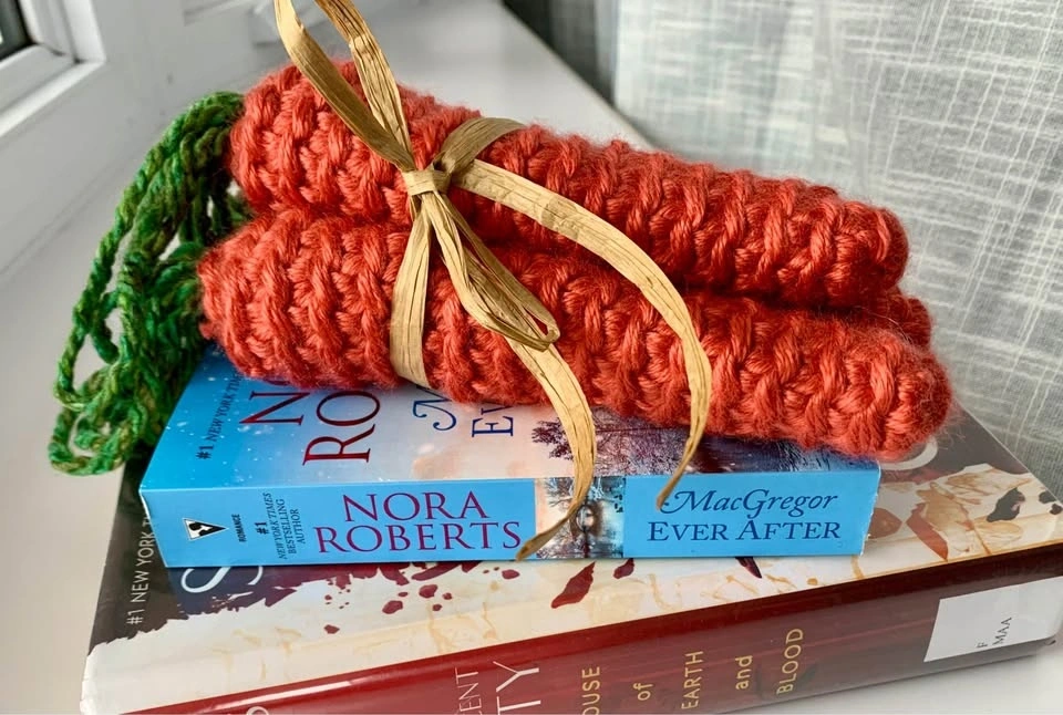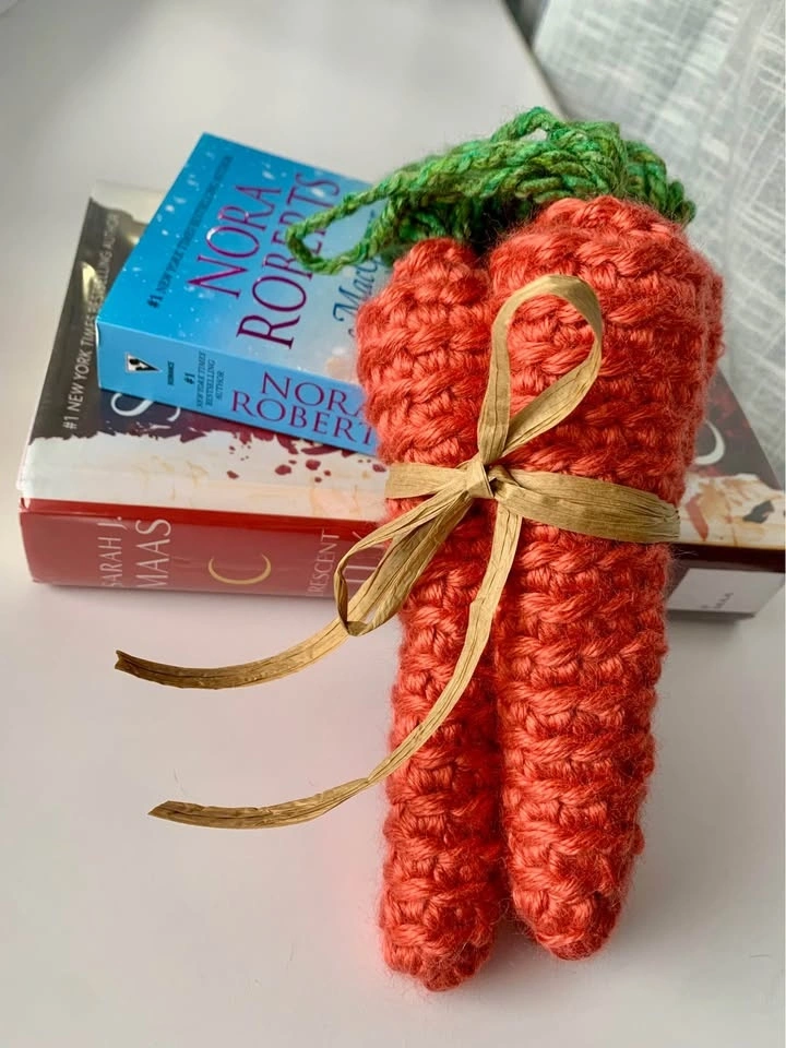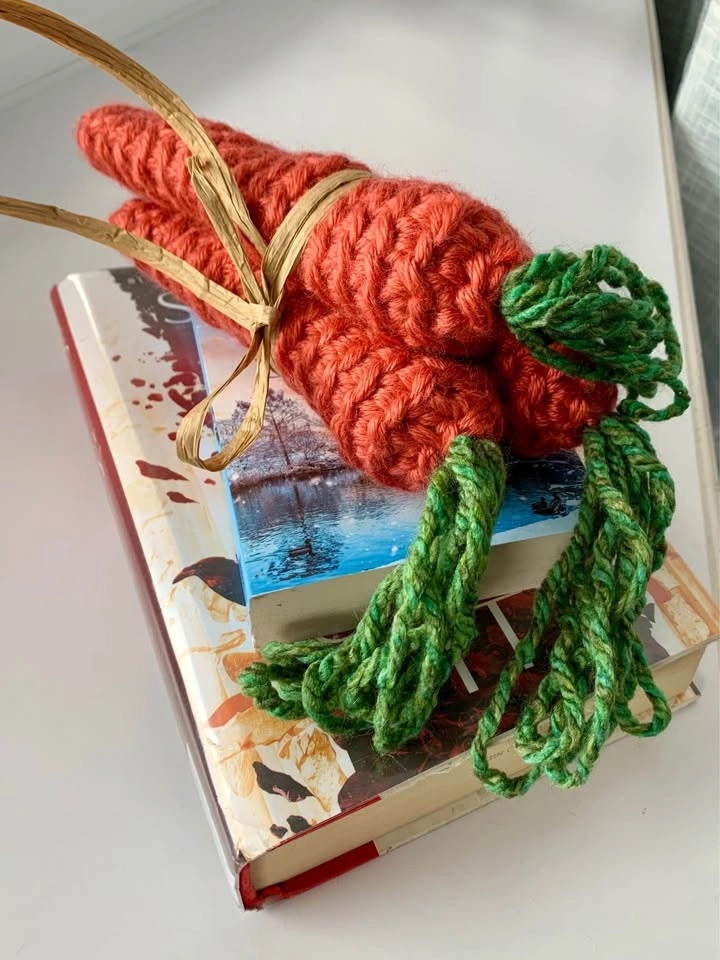 Lightweight bundle of three handmade carrots, bundled together with paper ribbon for a farmhouse look.