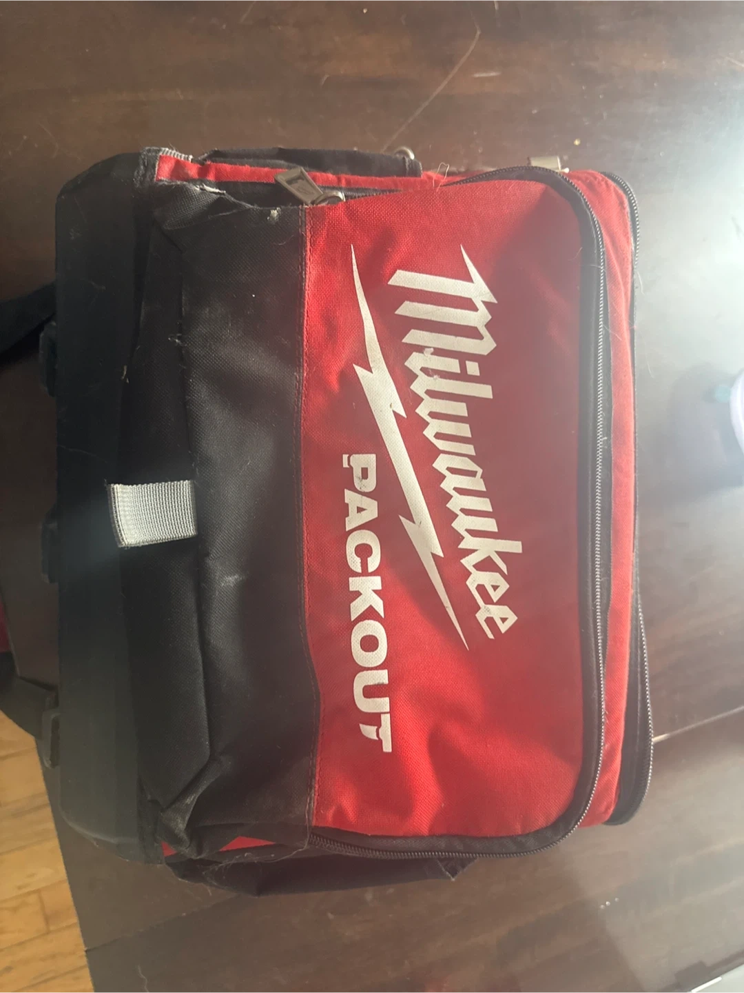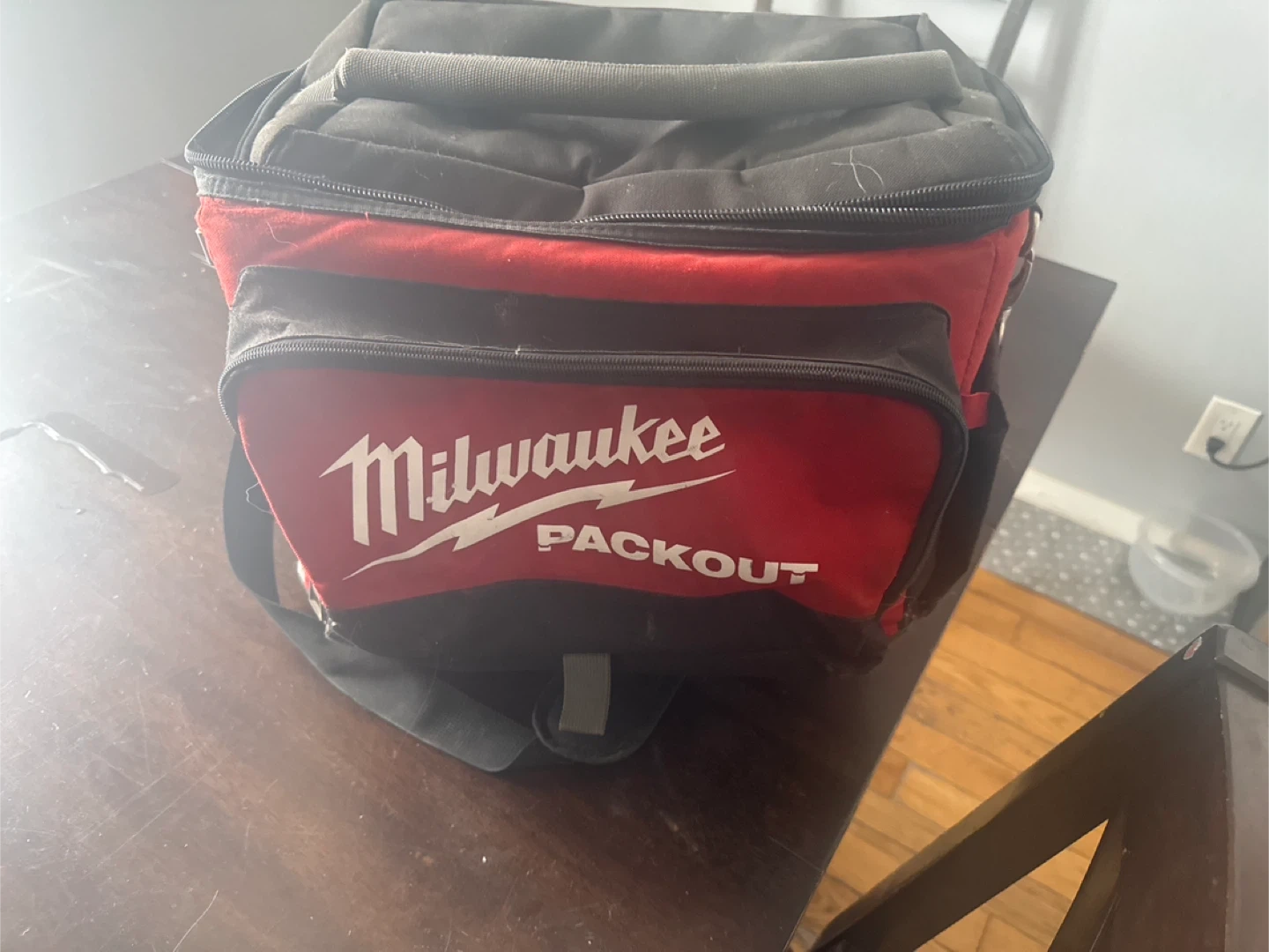 This is a Milwaukee PACKOUT soft cooler bag. It's red and black with a zippered main compartment and a front zippered pocket. Ideal for keeping drinks and snacks cool on the go!