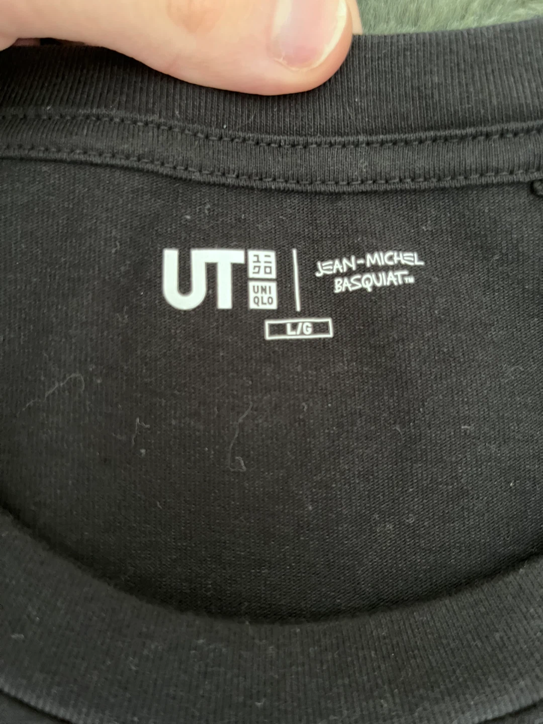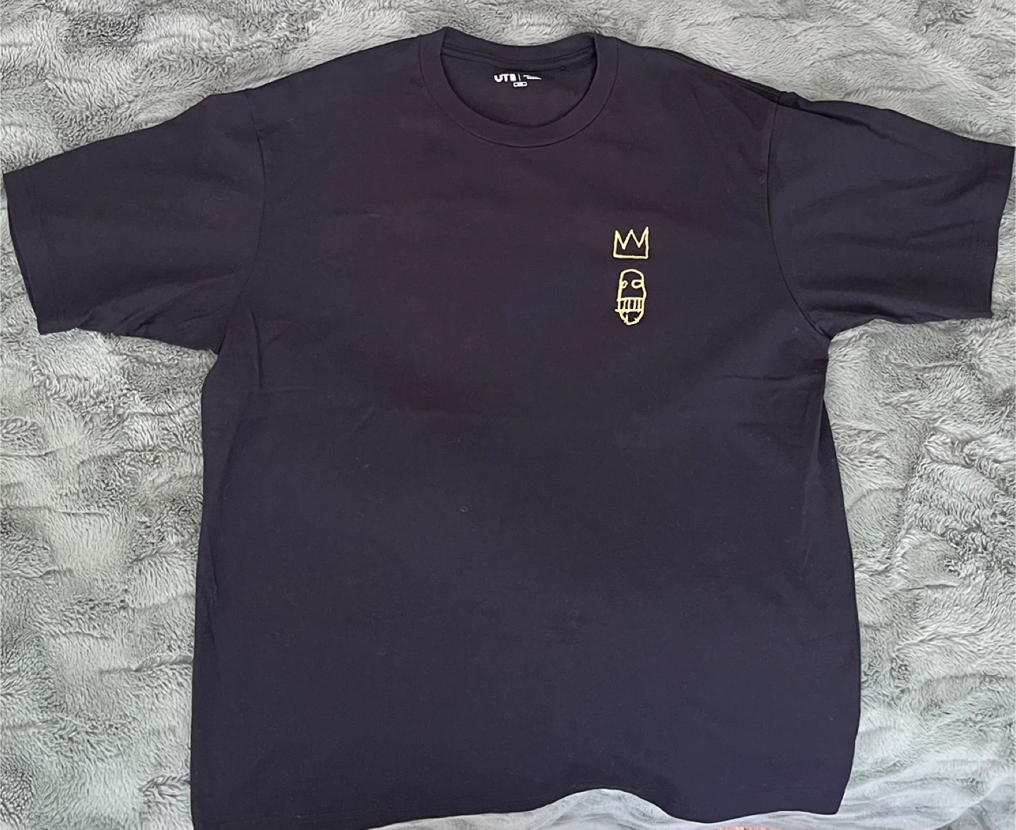 This is a black UNIQLO UT t-shirt featuring artwork by Jean-Michel Basquiat. It's a size large. Made from soft cotton for everyday wear.