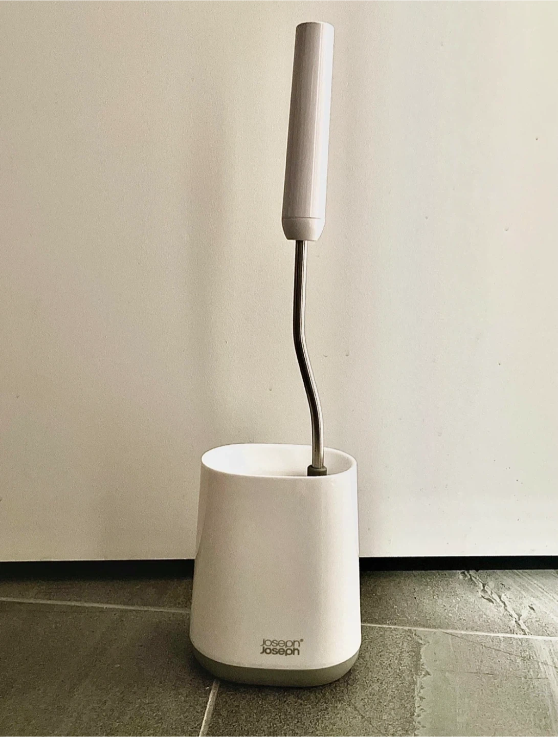 This is a Joseph Joseph toilet brush and holder set. It features a slim-profile container with a flexible stainless steel shaft and a white handle. The holder is white with a grey base.