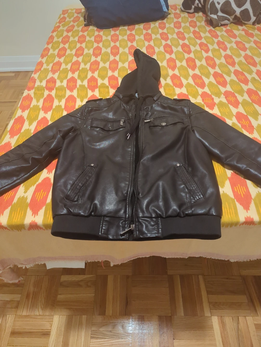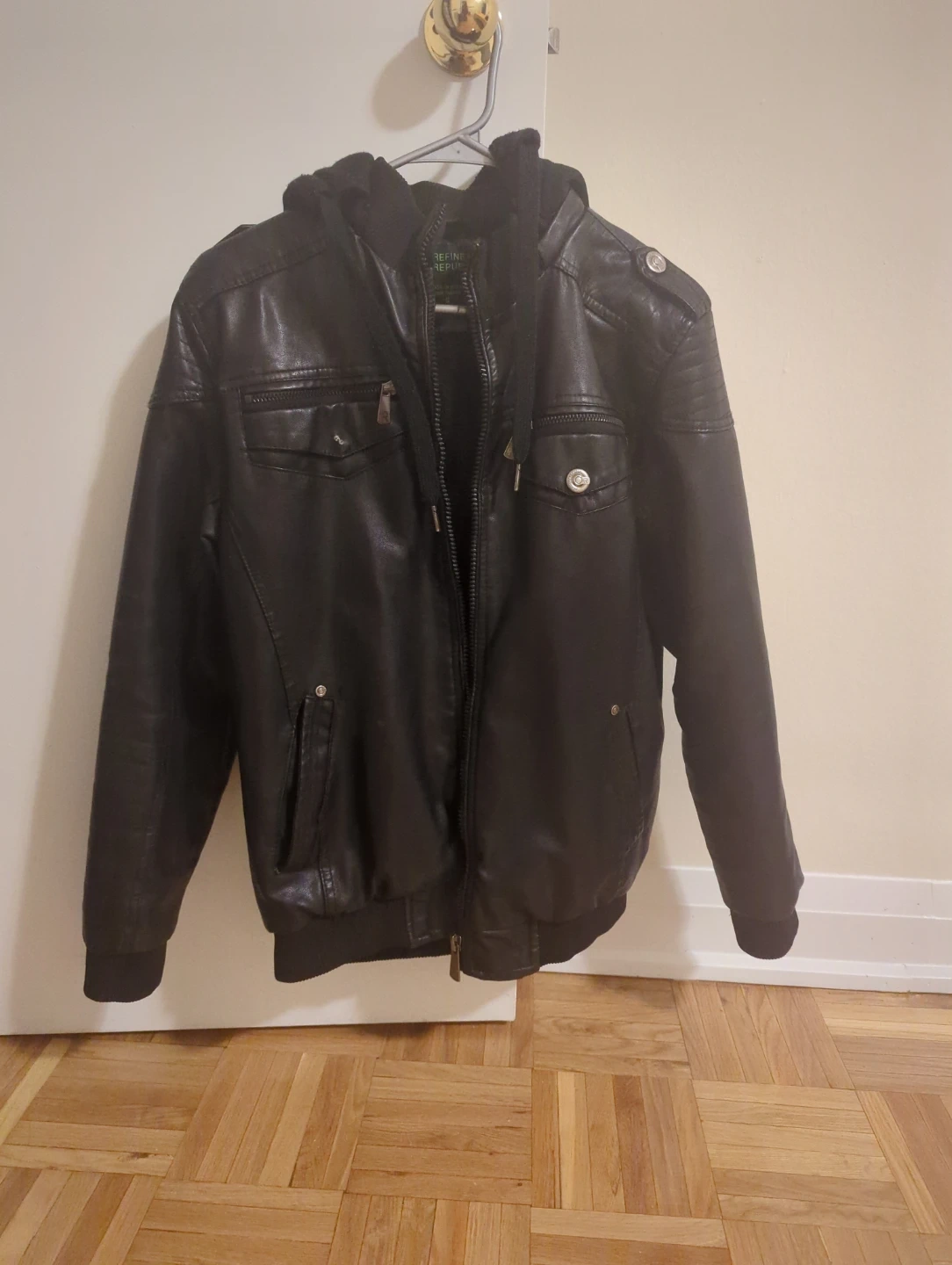 This black faux leather jacket features a full zip closure and two chest pockets. It has a comfortable hood attached for extra warmth. Material is faux leather.