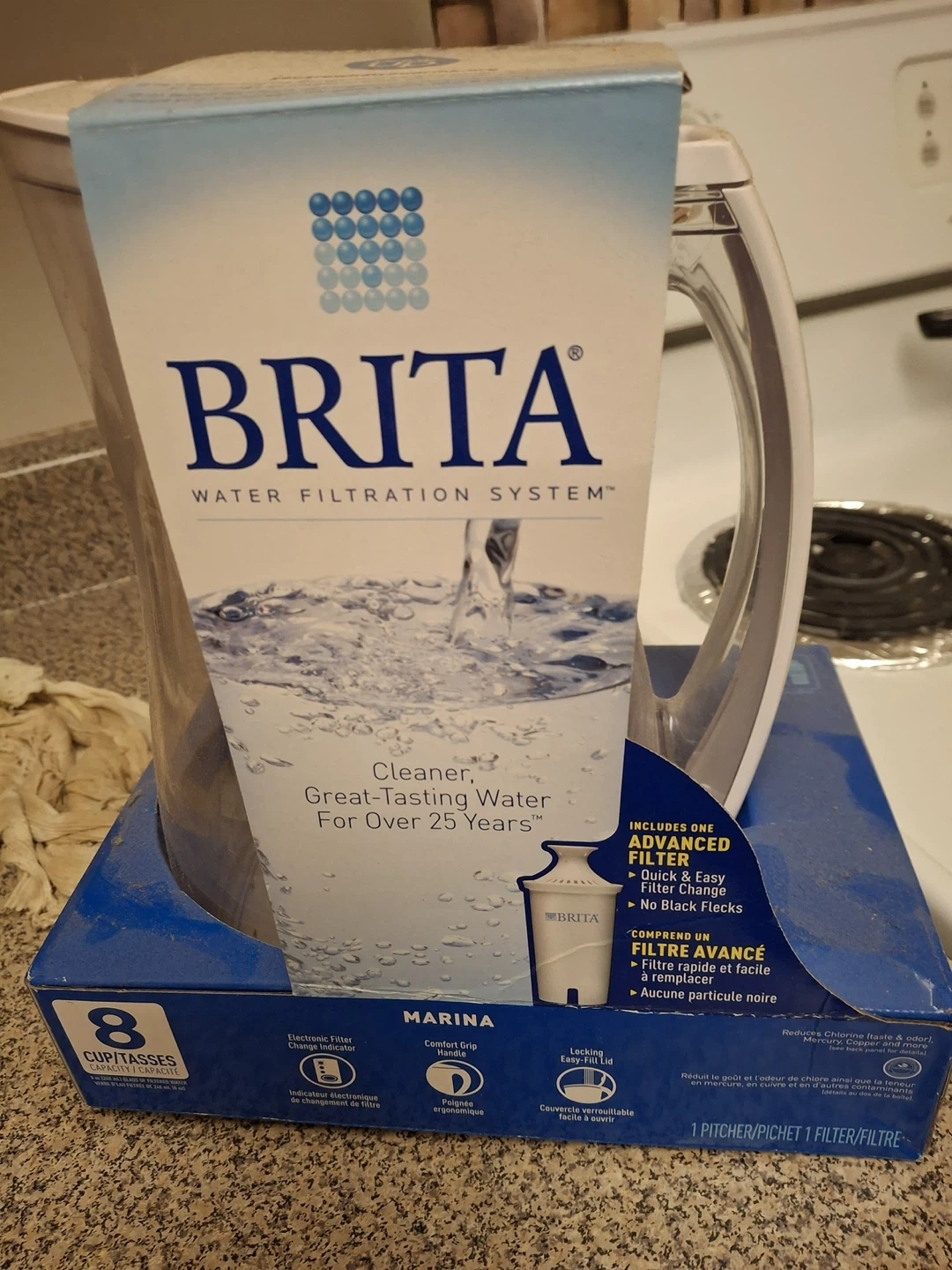 Brita Marina water filtration system for cleaner, great-tasting water. It's an 8-cup capacity pitcher. Comes with one advanced filter, featuring quick and easy filter change and no black flecks.