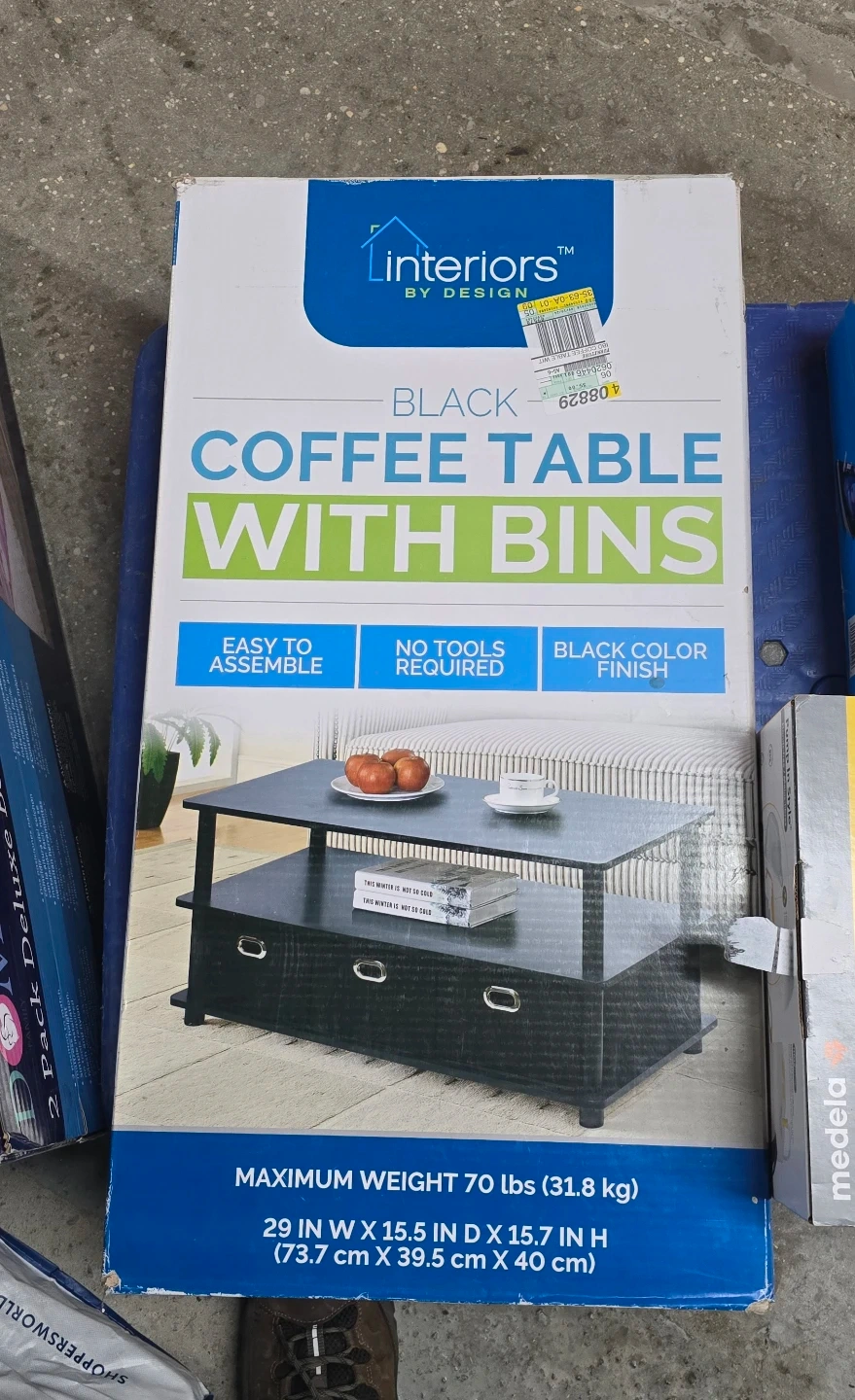 This is a black coffee table with bins. It's easy to assemble and requires no tools. The dimensions are 29" W X 15.5" D X 15.7" H. It has a maximum weight capacity of 70 lbs.