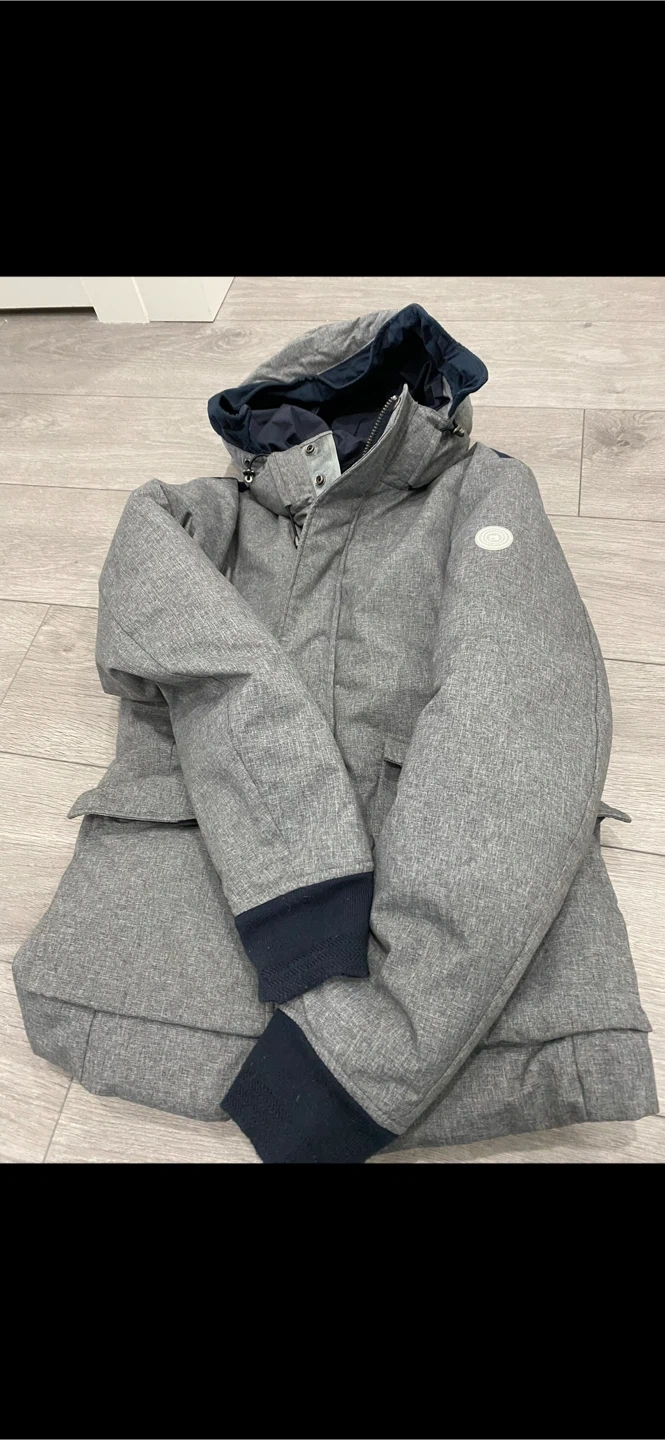A stylish and warm grey winter jacket. The jacket features a unique design with multiple pockets and a cozy interior lining. Perfect for keeping your little one snug during the colder months!