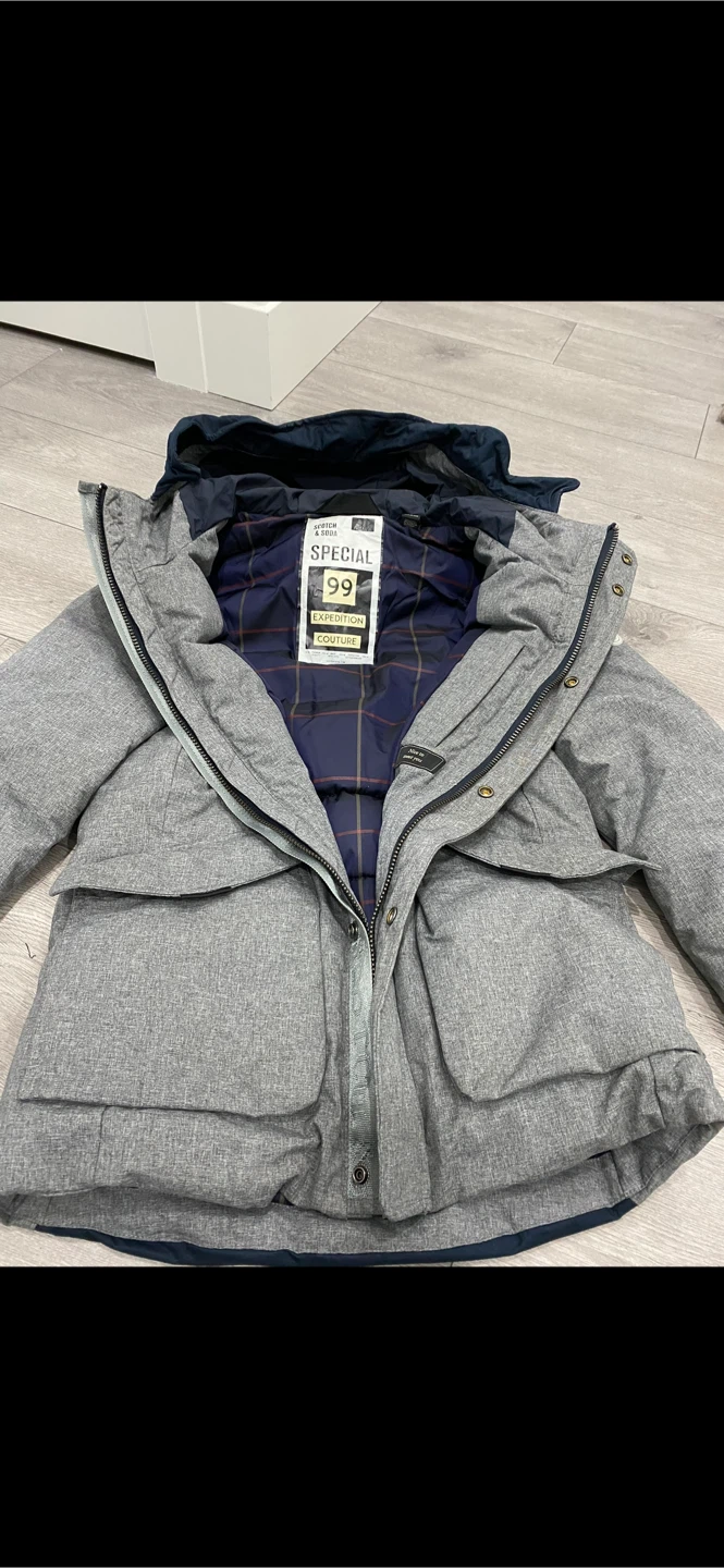 A stylish and warm grey winter jacket. The jacket features a unique design with multiple pockets and a cozy interior lining. Perfect for keeping your little one snug during the colder months!