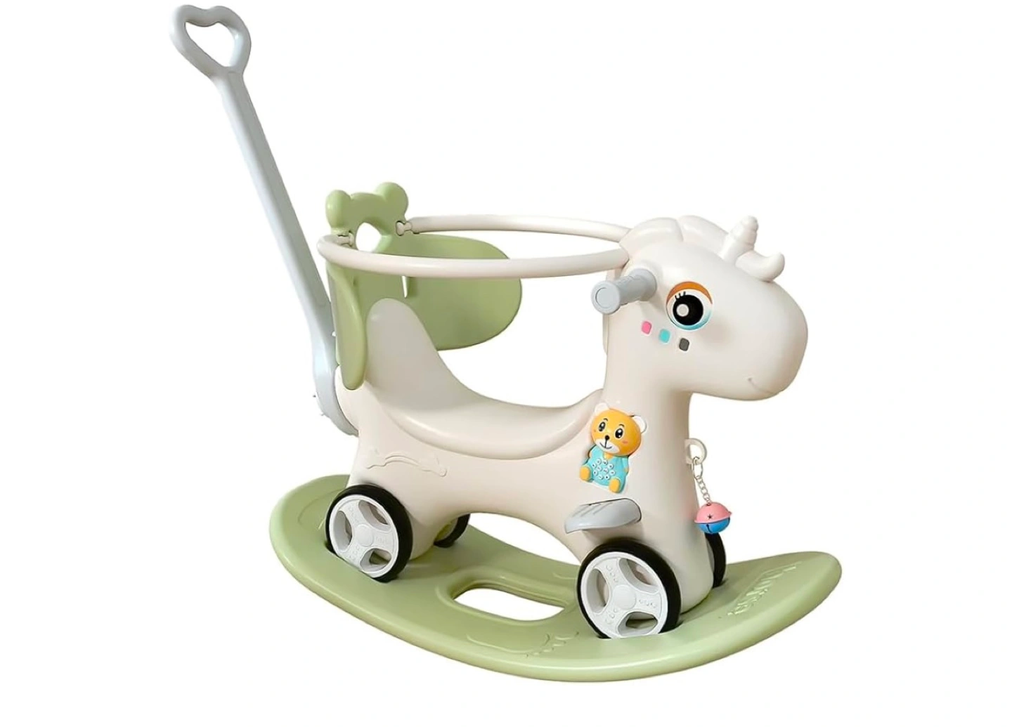 Rocking horse with wheels, push handle, and safety bar. Features sound and light effects. Great for toddlers.