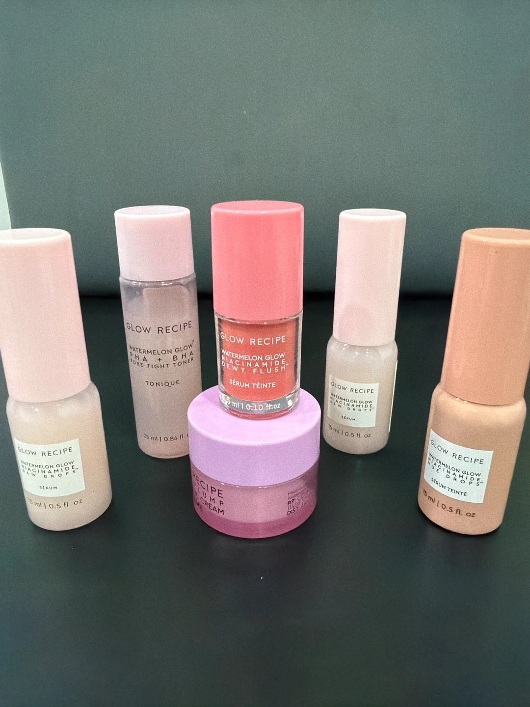 This bundle includes 2 Glow Recipe Watermelon Glow Niacinamide Dew Drops Serum, a Pore-Tight Toner, and a Dewy Flush Serum Teinte. Also features a Plump Cream.
