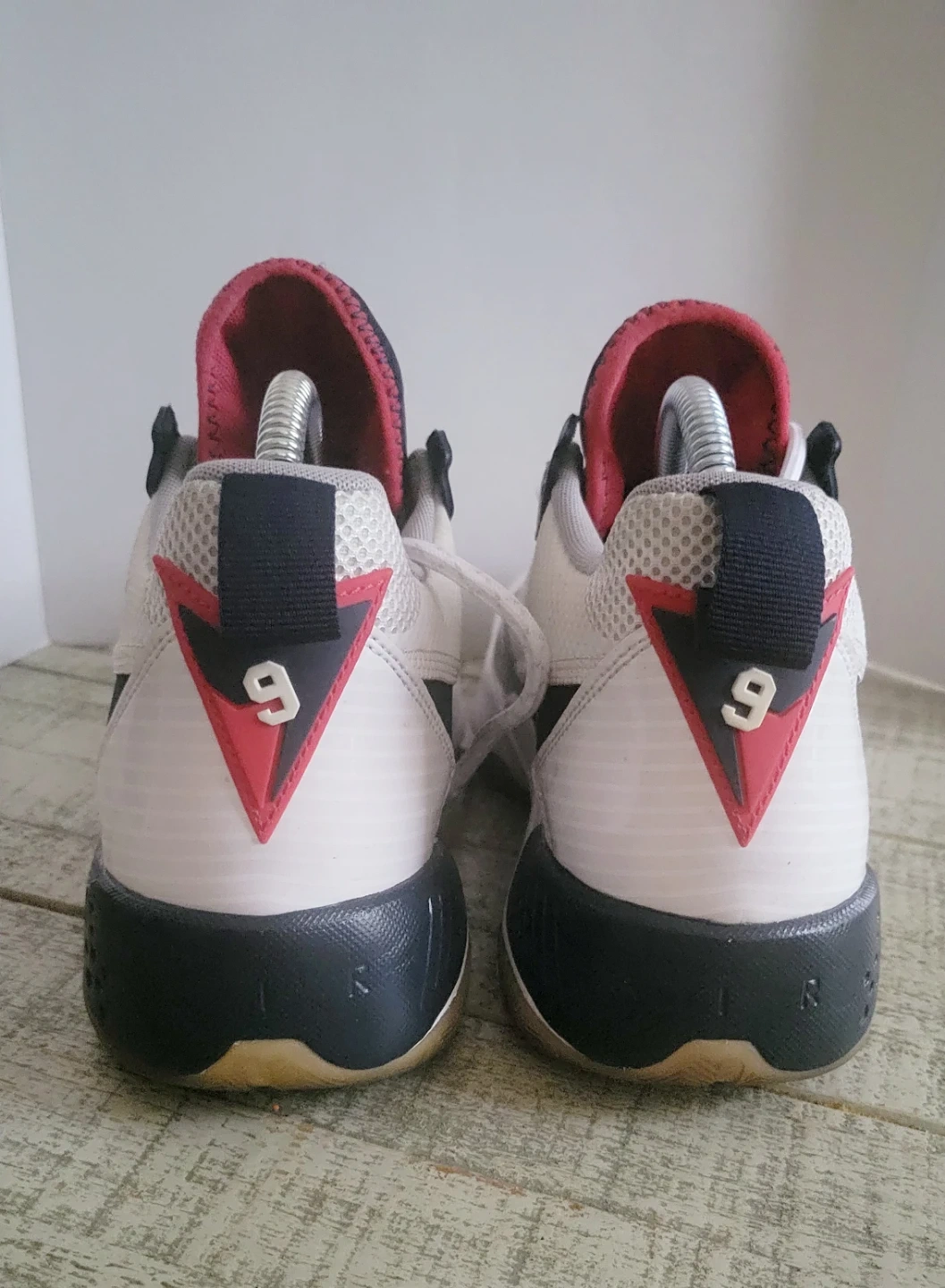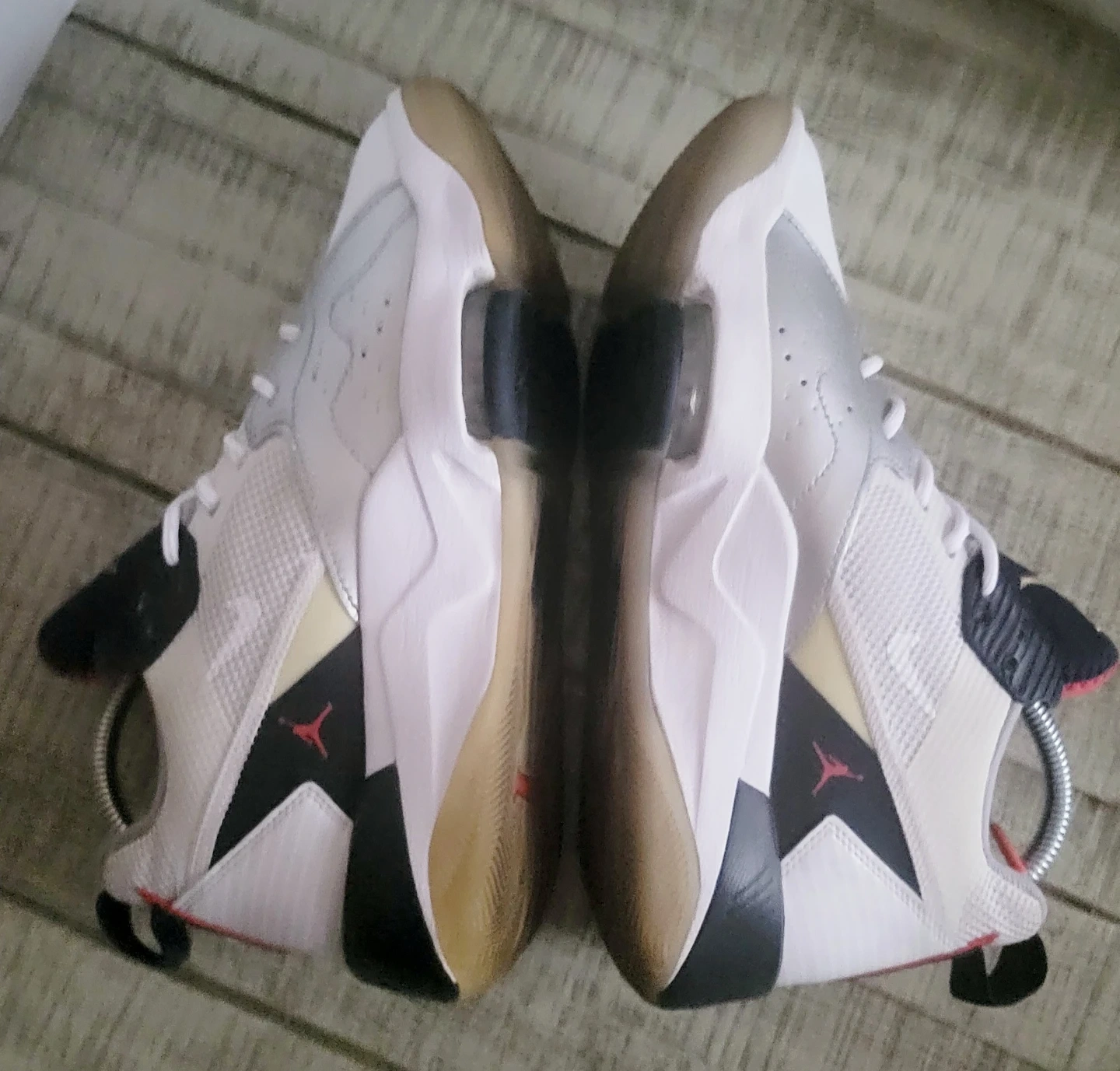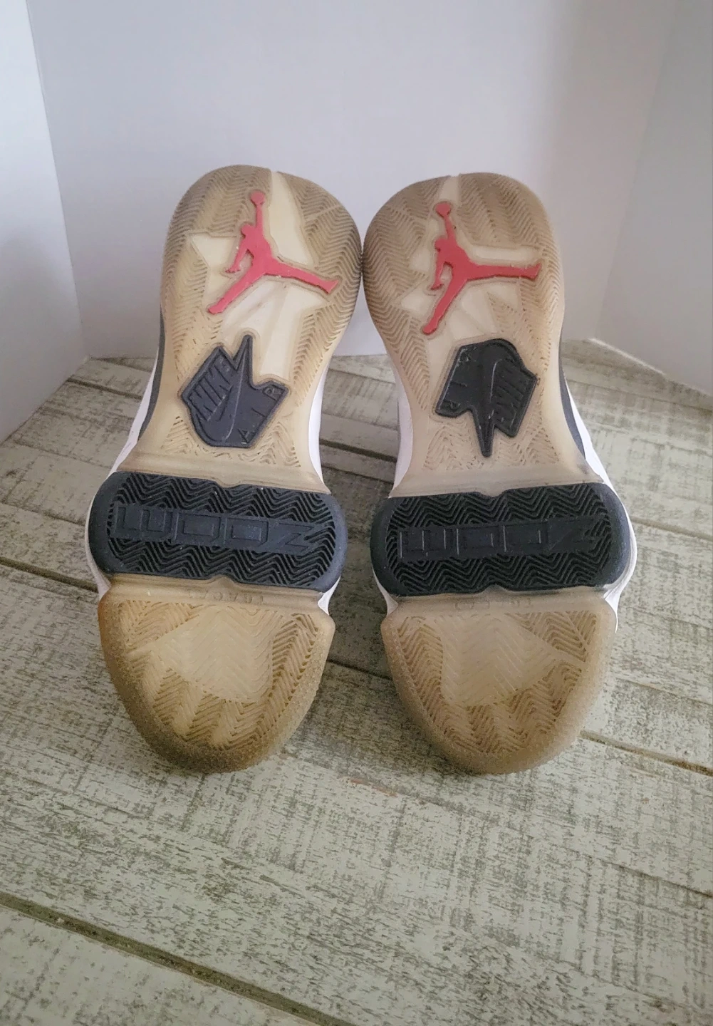 These Jordan kids' shoes are white with silver and red accents. They're a youth size 6Y (US) or 5.5 (UK). Great condition