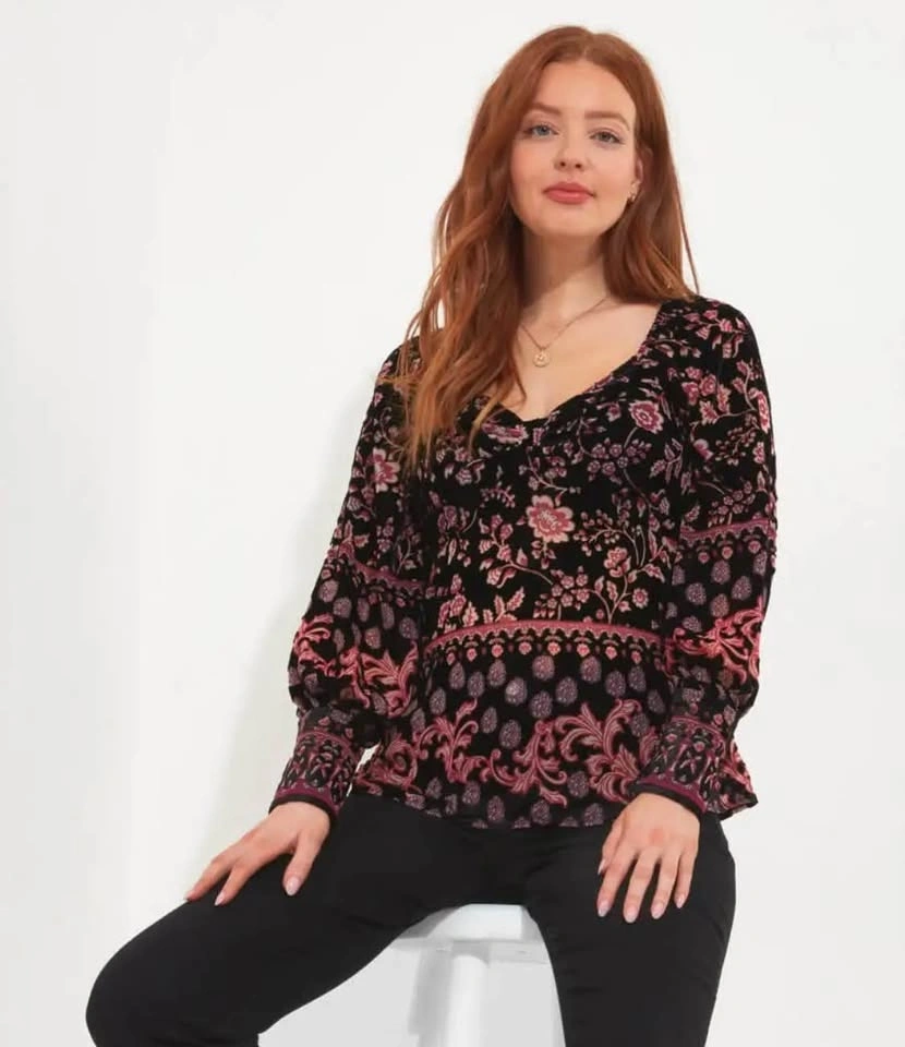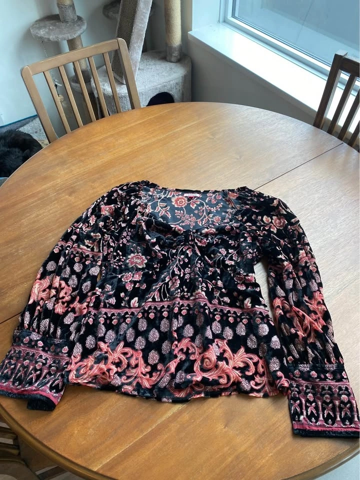 Unworn devoré top with balloon sleeves and bold print. Perfect for everyday or pairing with your fave jeans to go out in. No damage, in excellent condition. Brand Joe Browns. Pickup only at Boundary and Hastings.