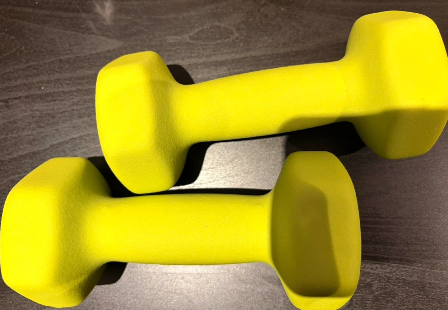 Two lime green dumbbells, each weighing 5lb. They have a hexagonal shape and a soft, grippy coating. Great for home workouts or adding resistance to your fitness routine!
