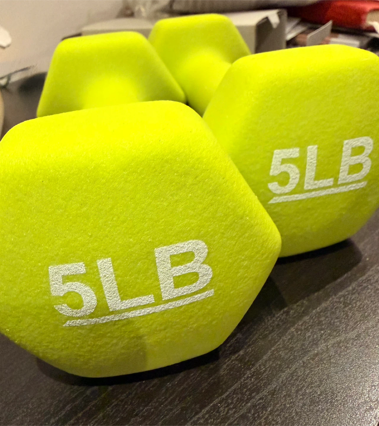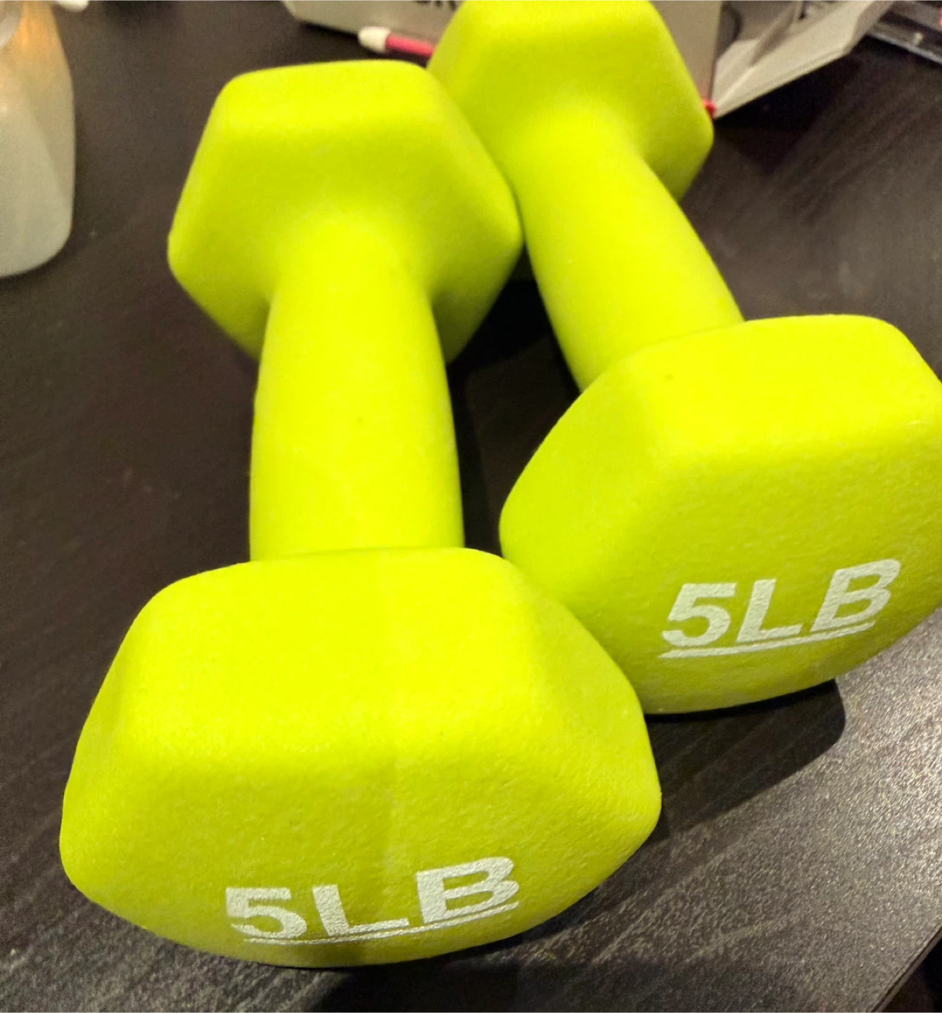 Two lime green dumbbells, each weighing 5lb. They have a hexagonal shape and a soft, grippy coating. Great for home workouts or adding resistance to your fitness routine!