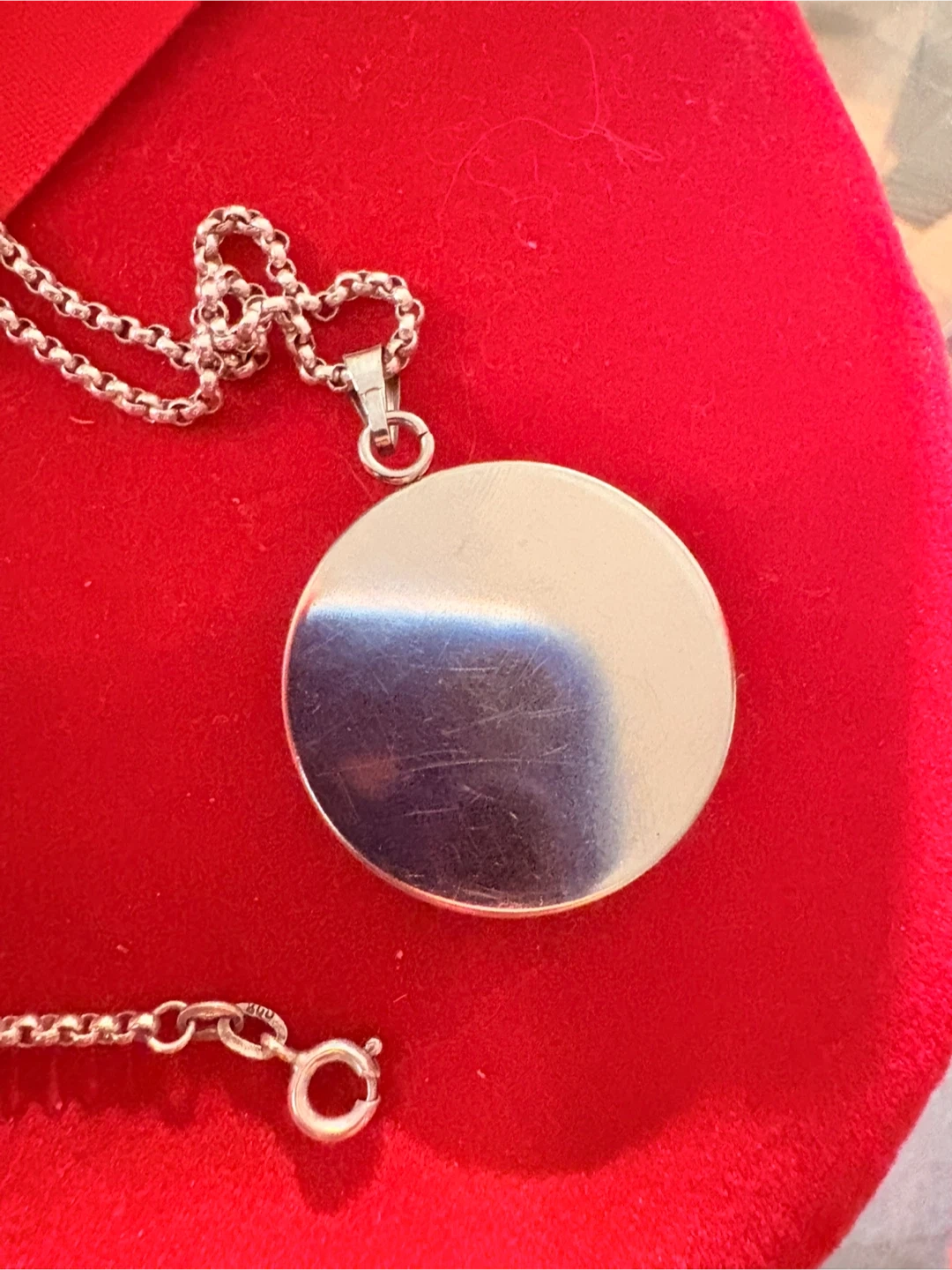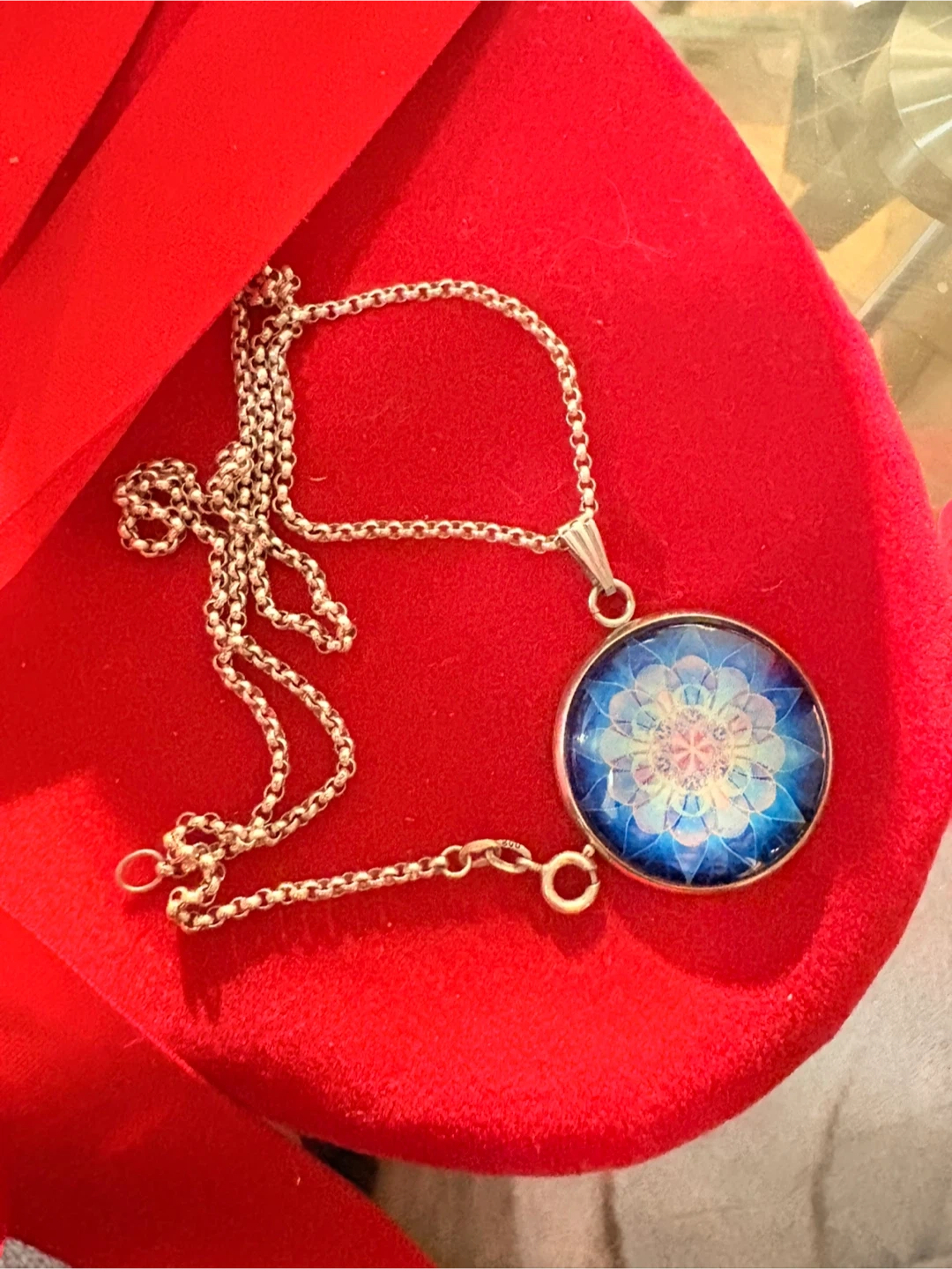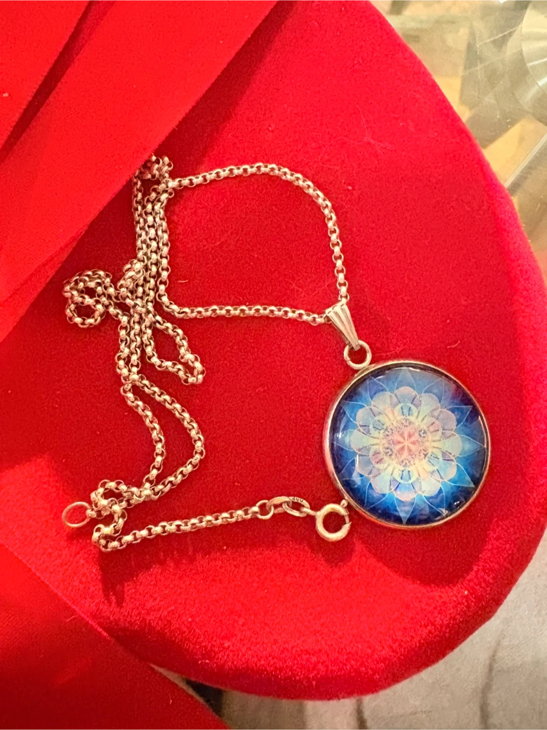 Selling a lovely silver pendant necklace. One side is plain silver, and the other has a beautiful blue and white floral design. It's in great condition and ready for a new home