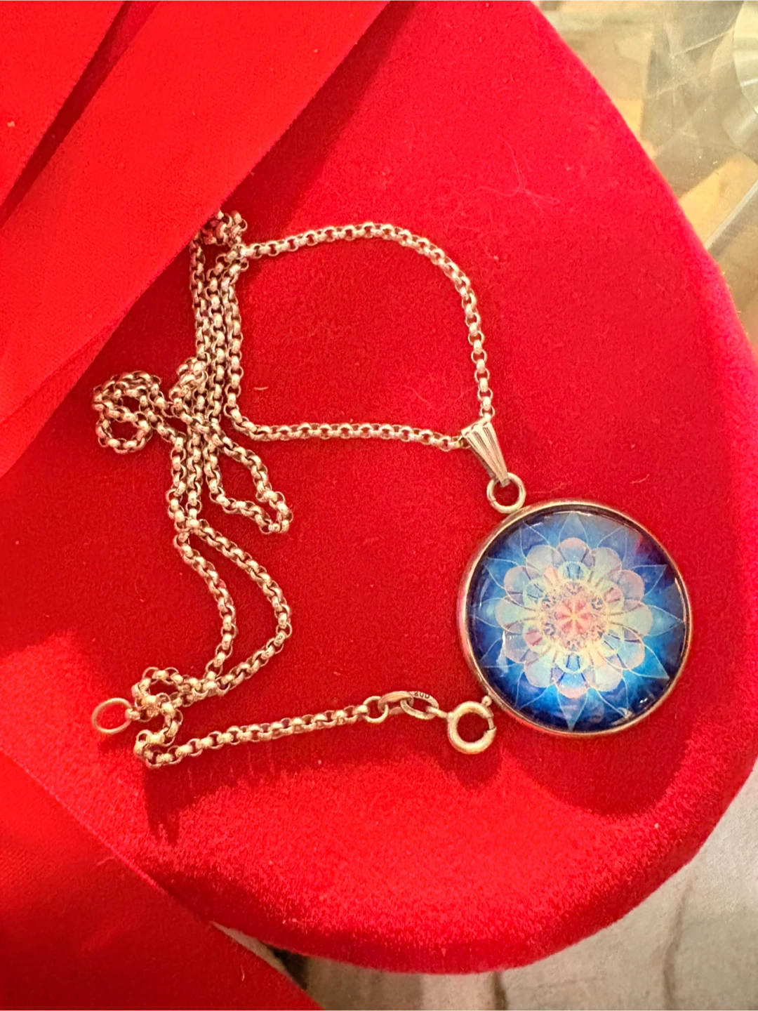 Selling a lovely silver pendant necklace. One side is plain silver, and the other has a beautiful blue and white floral design. It's in great condition and ready for a new home