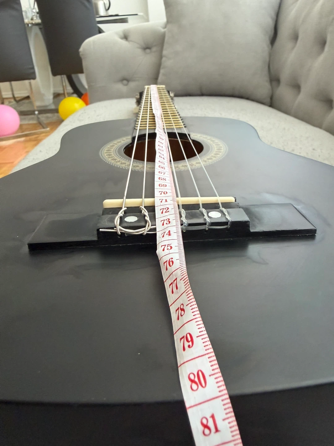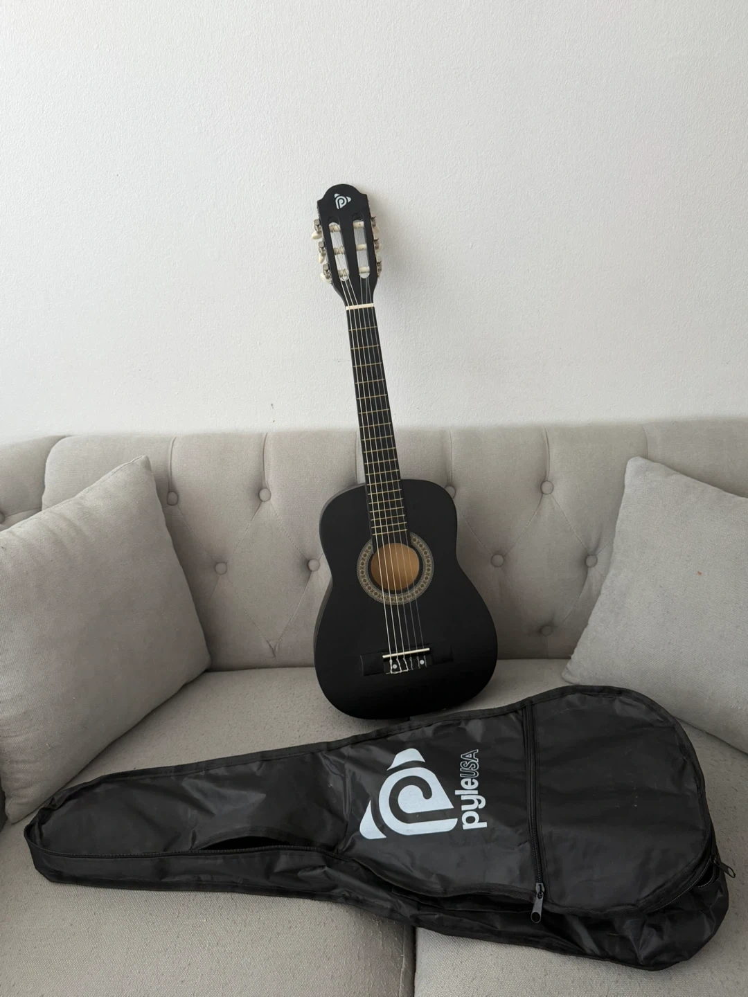 This is a black Pyle acoustic guitar. It includes a gig bag for easy transport. A measuring tape shows the guitar's length from the bridge to approximately the 80cm mark.
