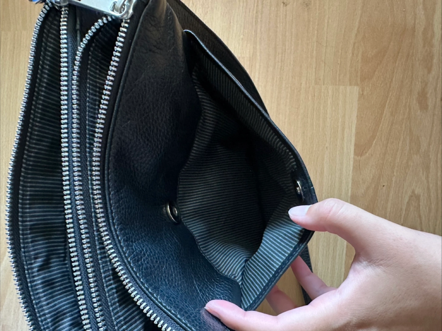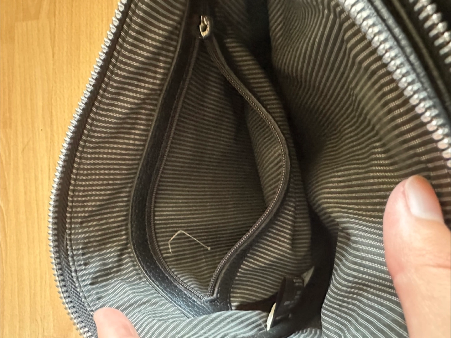 It features a zippered closure and multiple compartments inside, perfect for keeping your essentials organized. The interior lining is a stylish striped pattern. It's a great everyday purse!