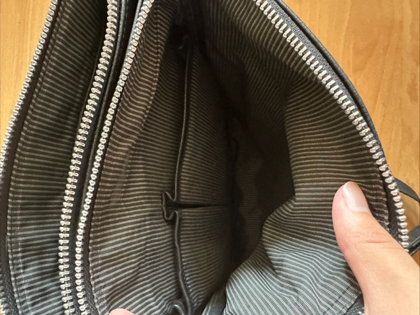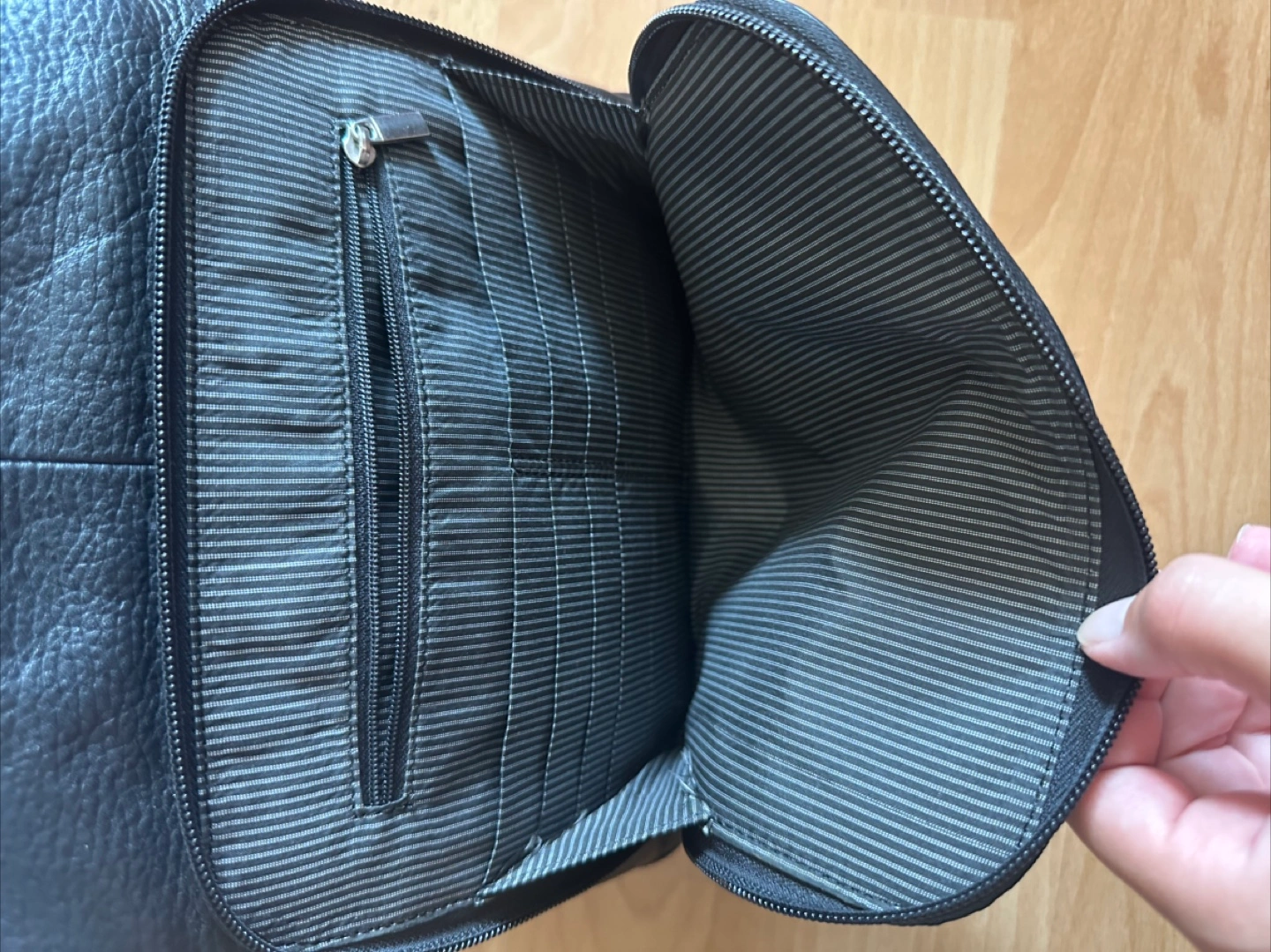 It features a zippered closure and multiple compartments inside, perfect for keeping your essentials organized. The interior lining is a stylish striped pattern. It's a great everyday purse!