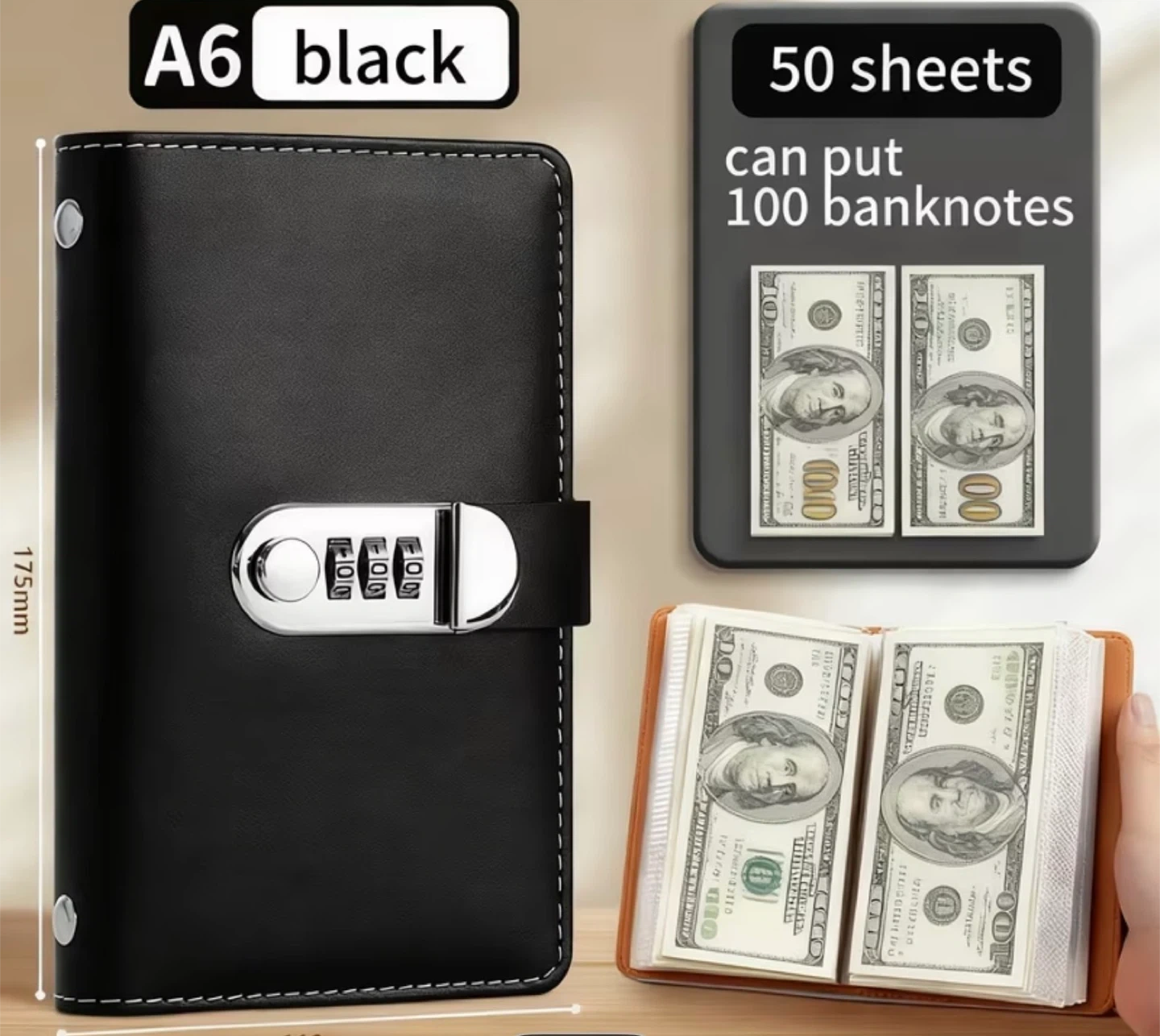 This notebook features a 3-digit combination lock to secure your notes. It's made of faux leather and comes in multiple colors. The pages are lined for easy writing.