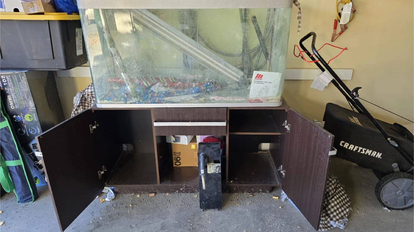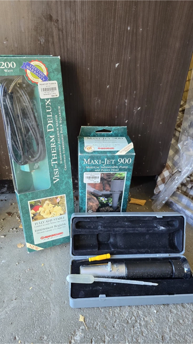 80 Gallons aquarium with a wooden cabinet stand. Includes a Visi-Therm Deluxe submersible aquarium heater (200 watt) and a Maxi-Jet 900 submersible pump. A refractometer is also included for water testing. It's a complete setup for fish enthusiasts! Pickup from Nolan hill.