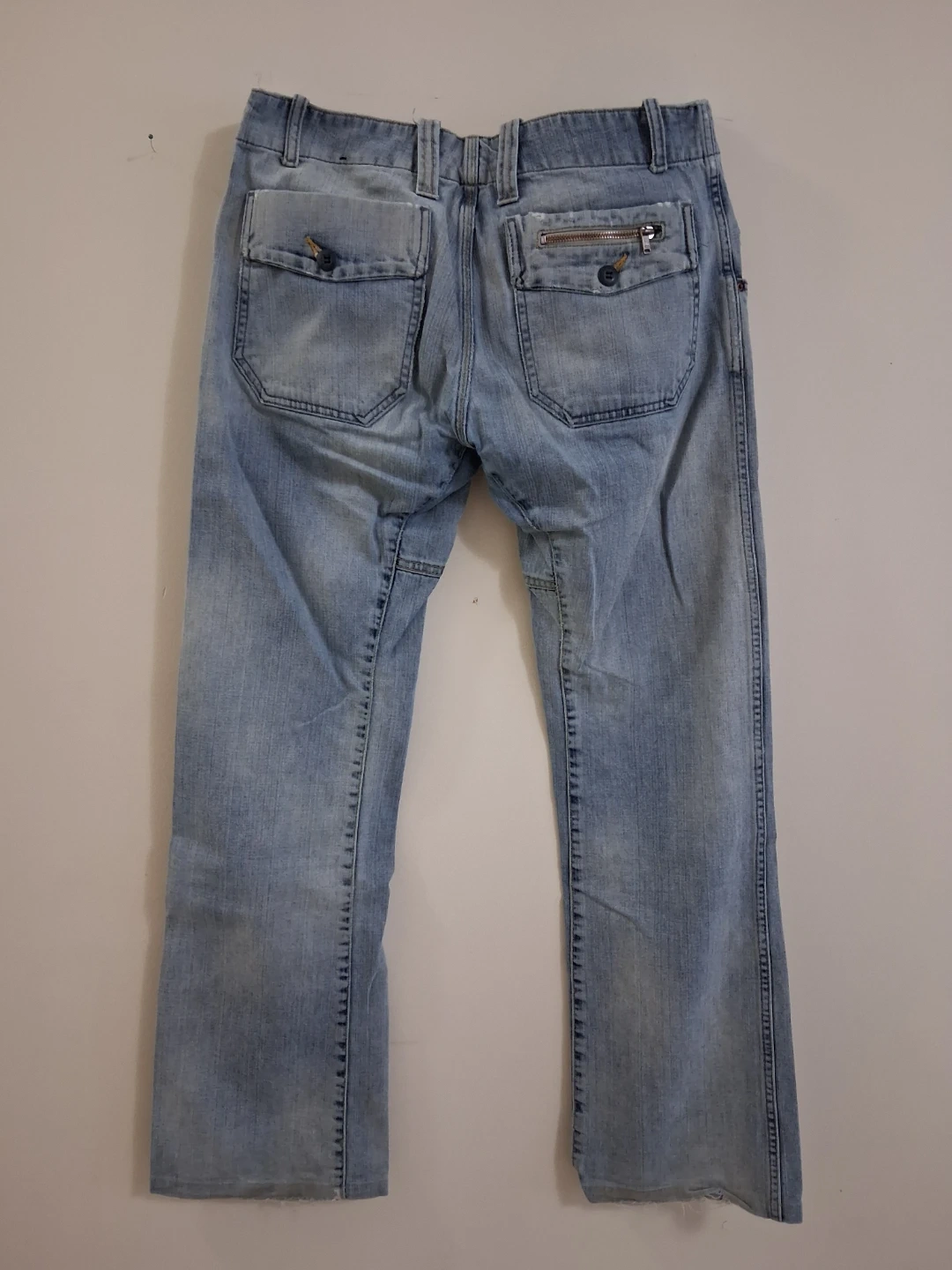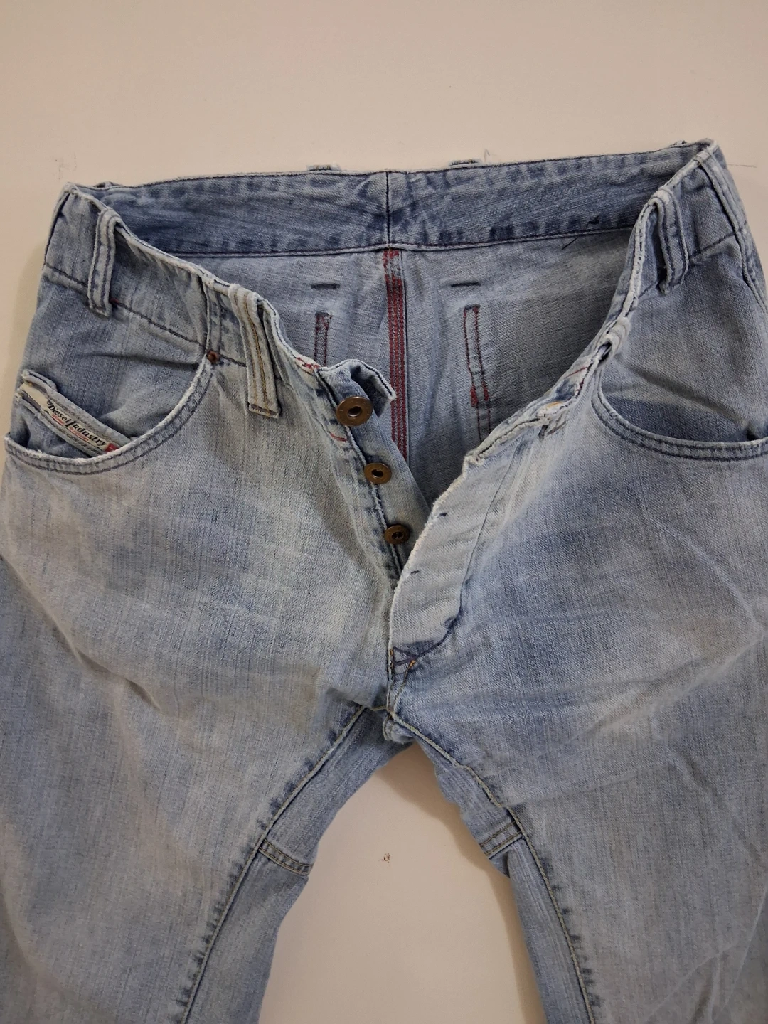 Diesel jeans in good condition. These are a light wash denim with a button fly and unique back pocket detailing. Perfect for a casual, stylish look!