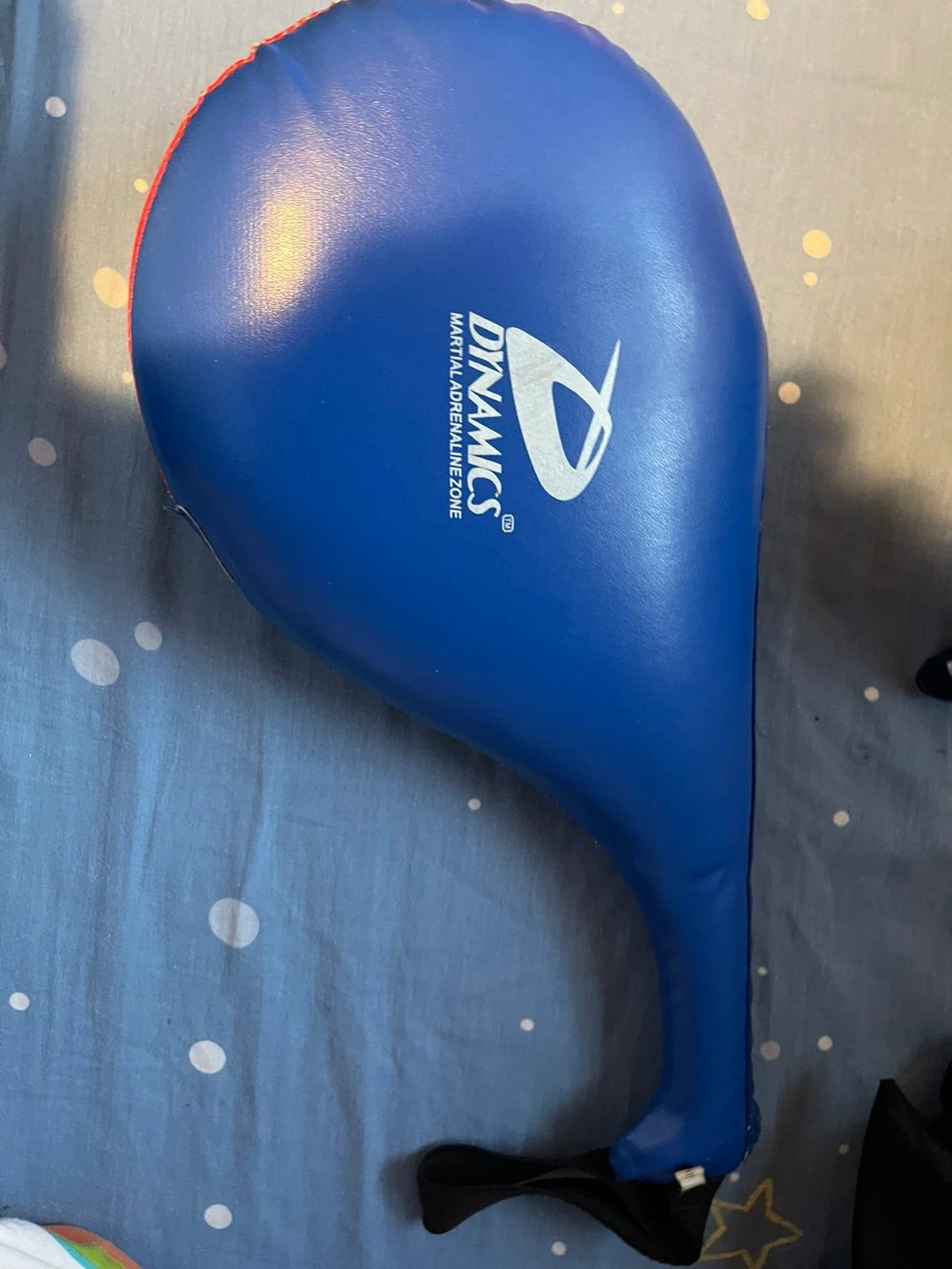 This blue Dynamics kick pad is designed for martial arts training. It features a sturdy construction suitable for practice. This pad is a great tool for developing kicking techniques.