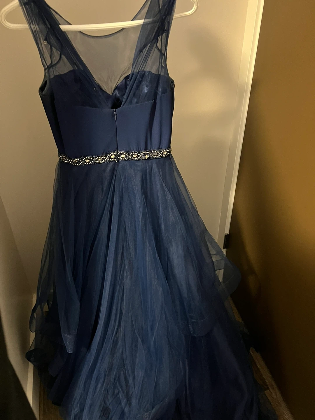 Selling a beautiful navy blue dress from Ed Young in size M. It features a lovely design with a jeweled belt detail. Perfect for a special occasion!