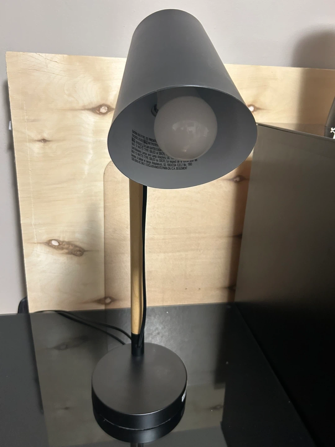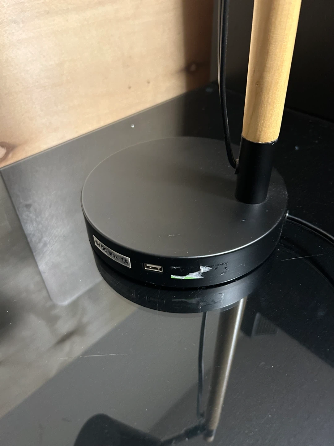 This black desk lamp features a stylish wood accent on the stand. It includes one USB ports on the base for convenient charging. Its adjustable arm and head allow you to direct the light where you need it most. Works well for task lighting.