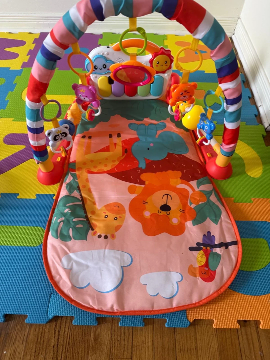 This colourful play mat features a soft padded surface with animal designs and an overhead gym with engaging toys. It includes a musical piano with lights and sounds. It's perfect for tummy time and sensory development for little ones.