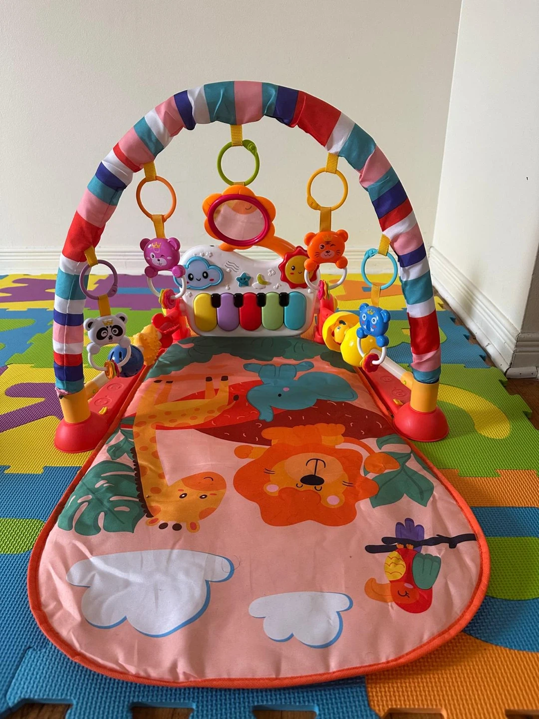 This colourful play mat features a soft padded surface with animal designs and an overhead gym with engaging toys. It includes a musical piano with lights and sounds. It's perfect for tummy time and sensory development for little ones.