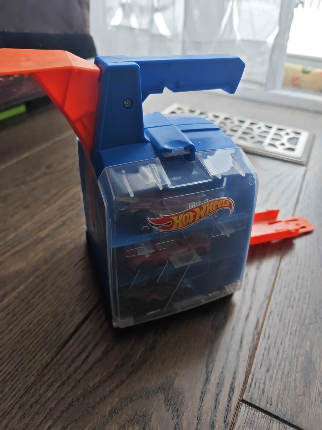 This Hot Wheels car carrier playset comes with a blue and orange carrier and five die-cast cars. It's great for storing and transporting your Hot Wheels collection!