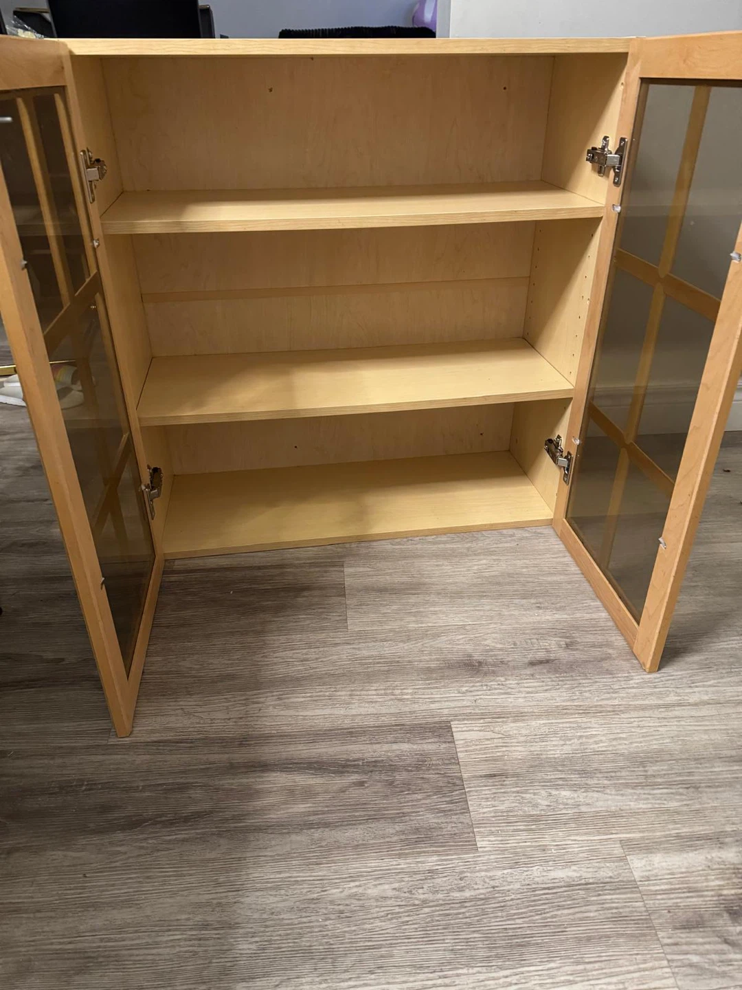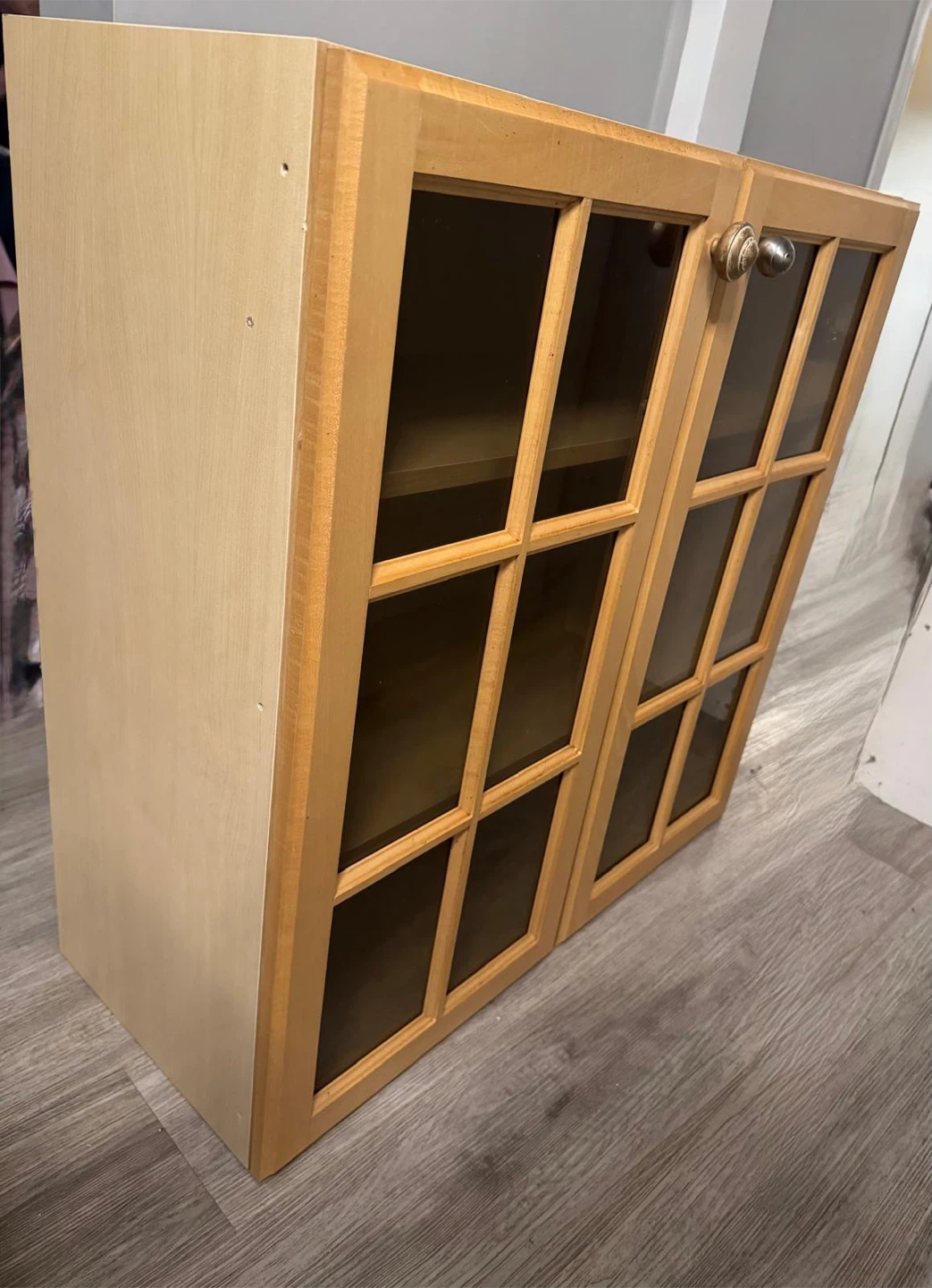 Here's a wooden cabinet with glass doors! It has a light wood finish and two doors with a grid pattern. Inside, there are shelves for storage. It's perfect for displaying items or storing kitchen essentials