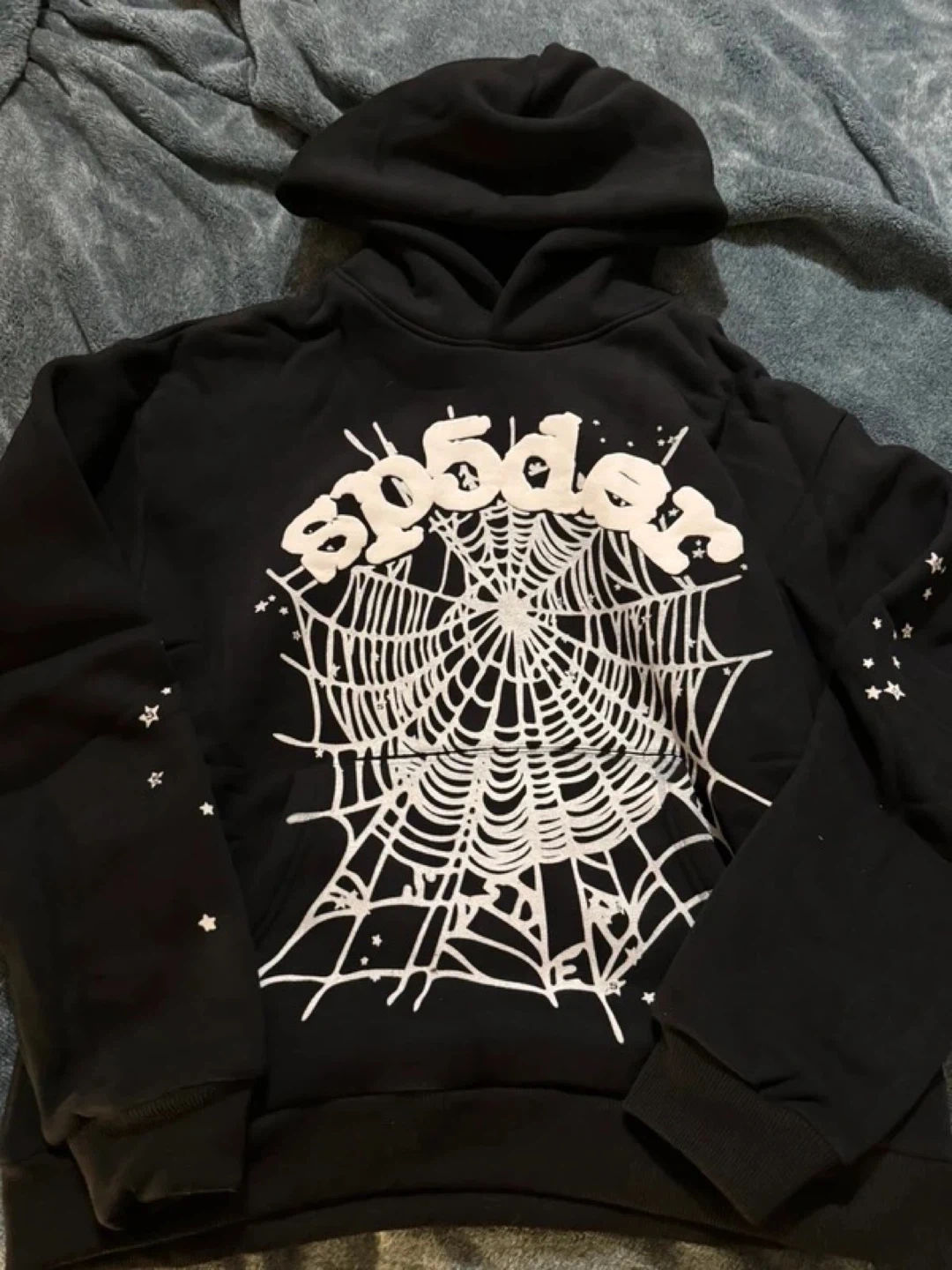 Black hoodie with white spiderweb graphic on the front and stars on the sleeves. It's a comfy pullover with a hood.