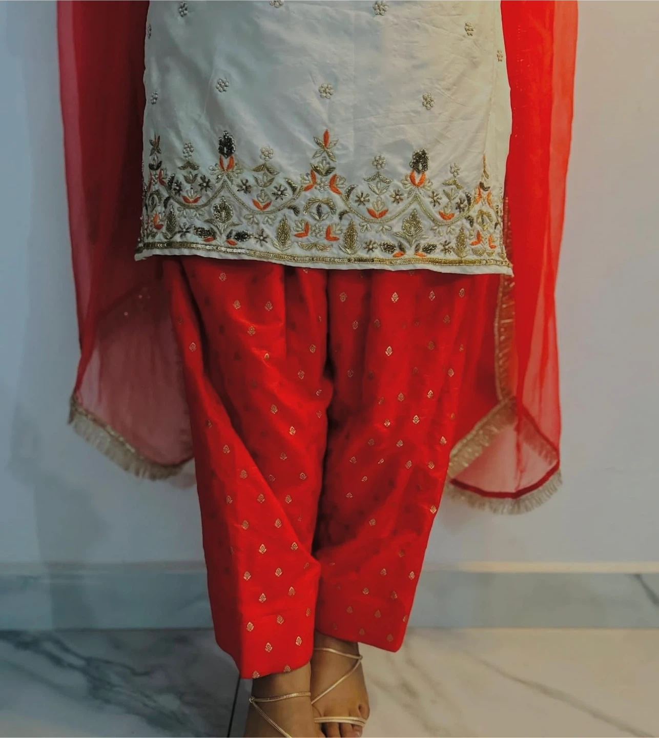 A beautiful purple kurti with matching pants and a sheer dupatta. The kurti features intricate embroidery with gold accents. Perfect for festive occasions or parties! Dm for more details