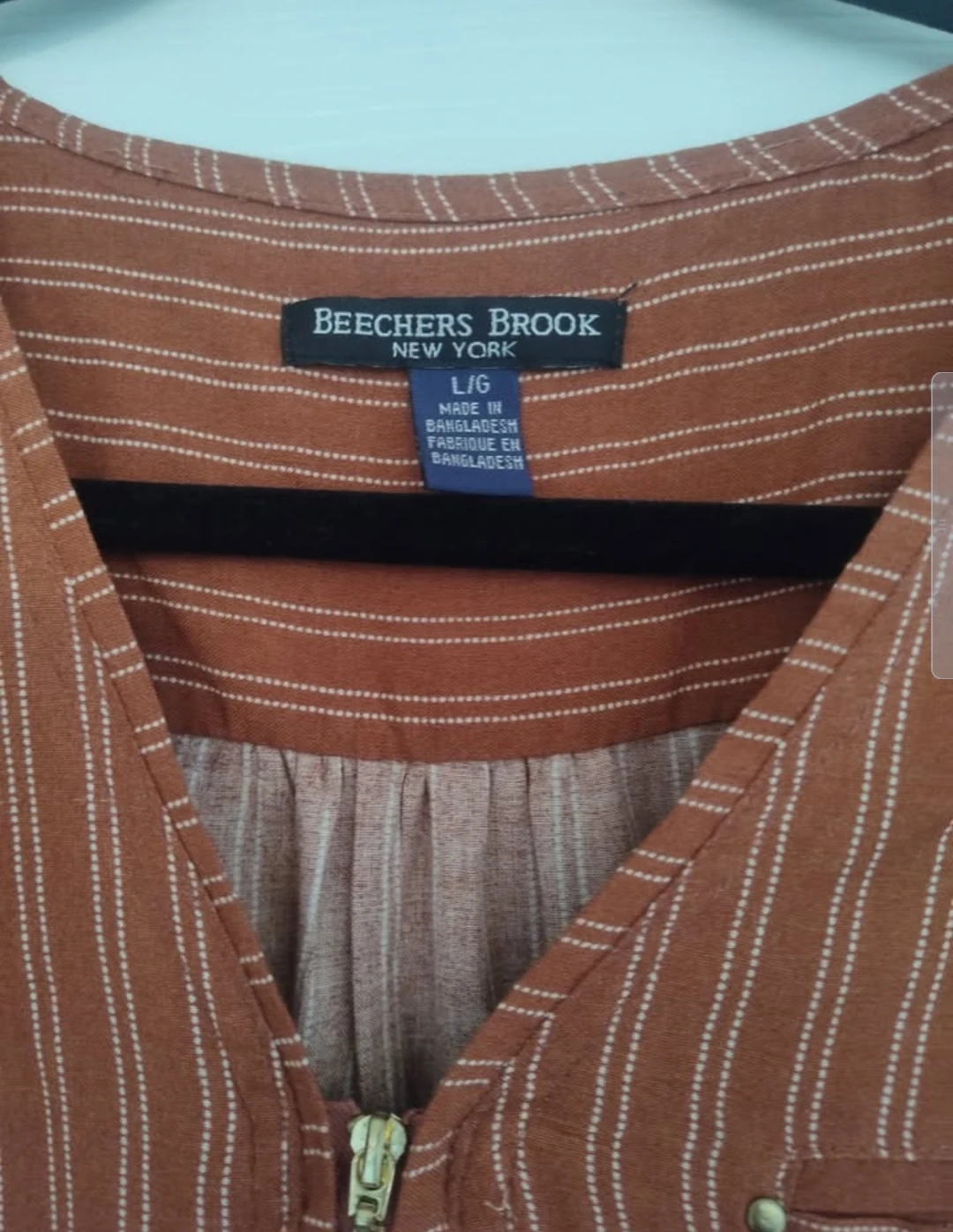 Selling a Beechers Brook blouse in size large! It features a striped pattern and a zip-up front. Originally bought for $59.99