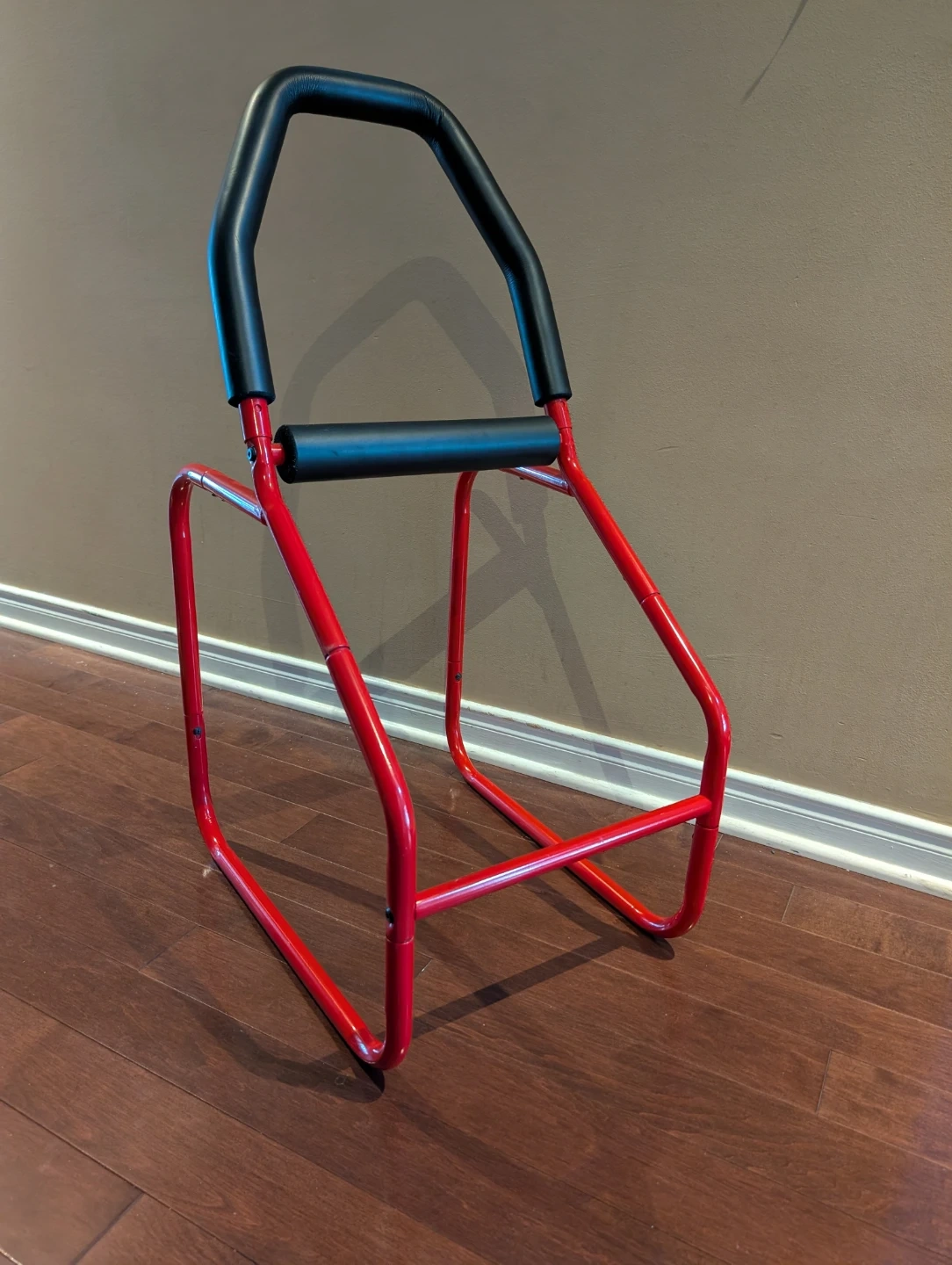 This used skating trainer is designed to help beginners learn to skate with confidence. The sturdy red frame and black handle provide support and stability on the ice.
