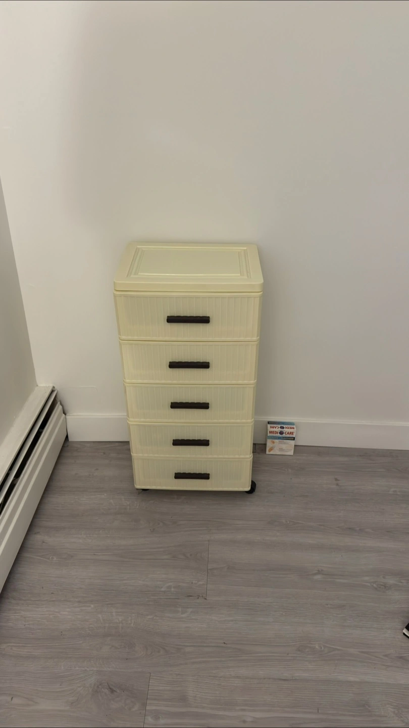 Here's a handy storage solution! This is a rolling cart with 5 drawers, perfect for organizing various items. It's plastic.