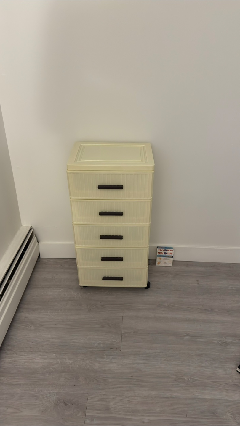 Here's a handy storage solution! This is a rolling cart with 5 drawers, perfect for organizing various items. It's plastic.