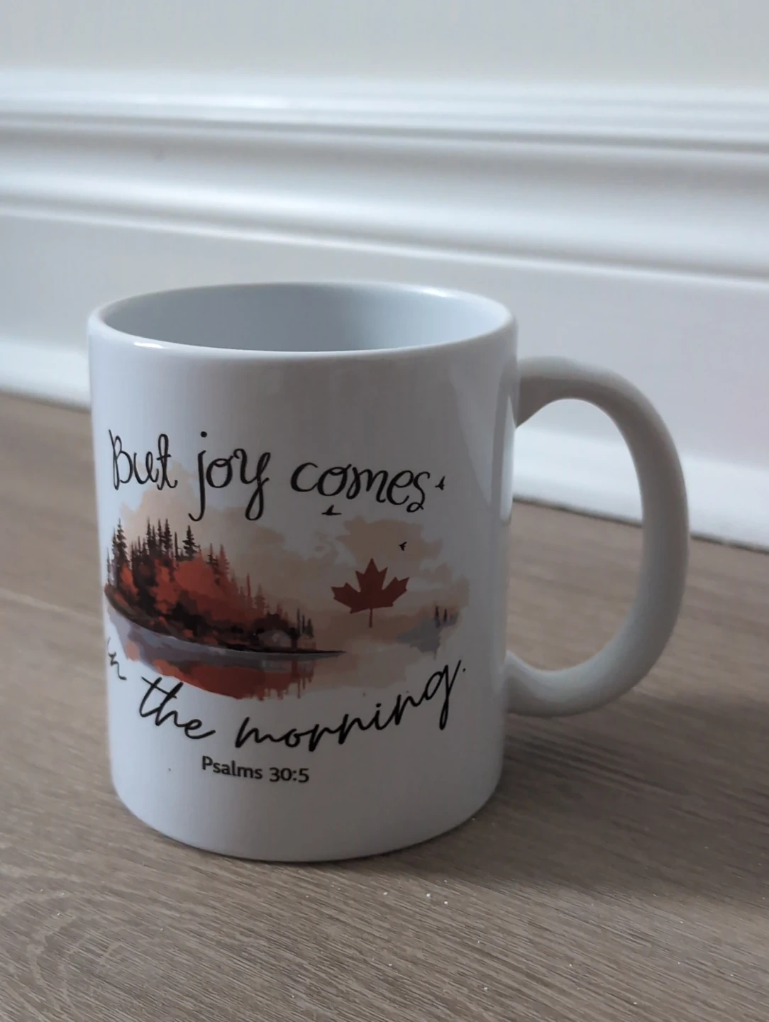 Mug with "But Joy Comes in the Morning" and Canadian Maple Leaf