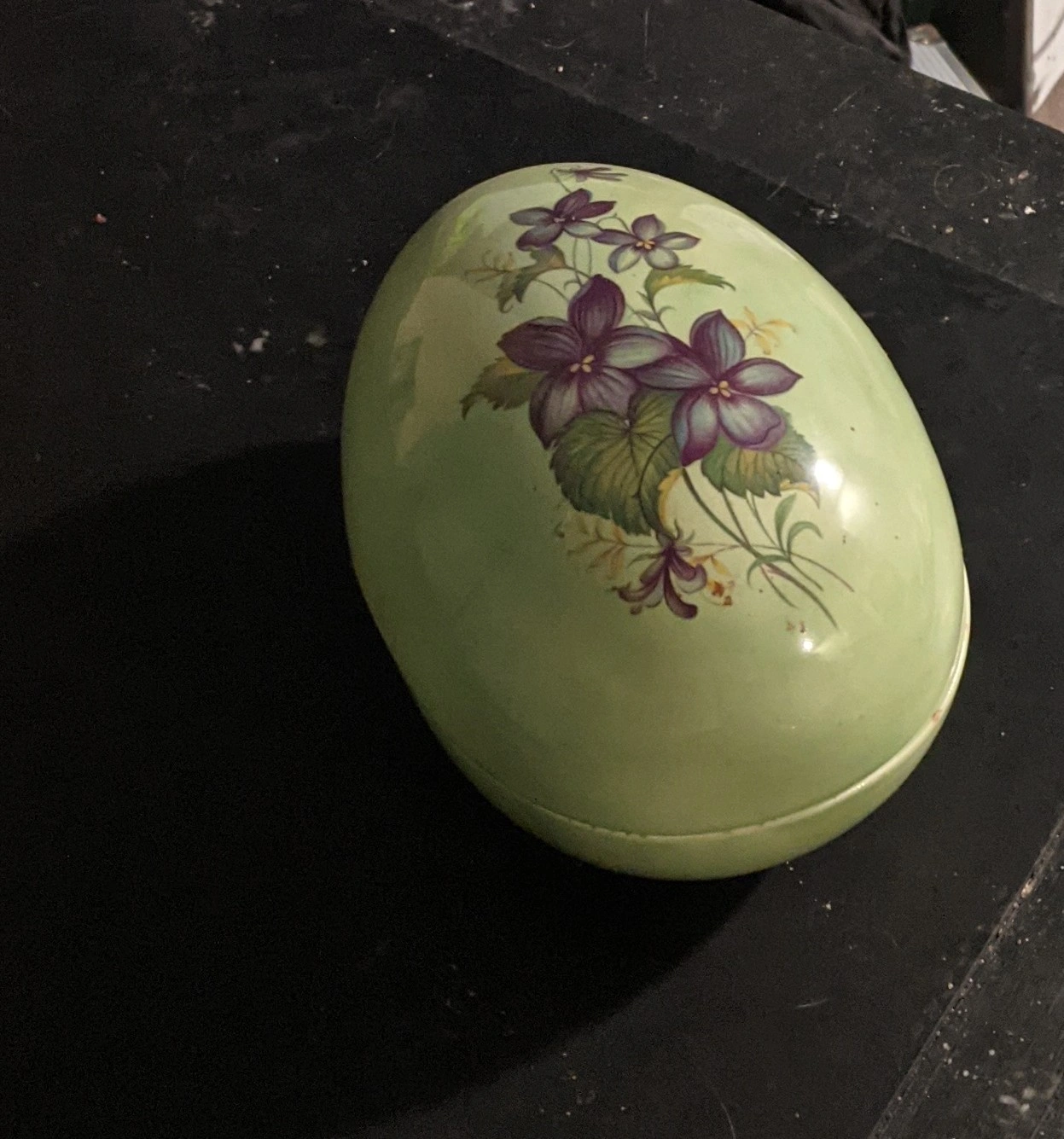 Selling a vintage egg-shaped trinket box. It's a lovely light green colour with a floral design on the top. Perfect for storing small items or as a decorative piece!