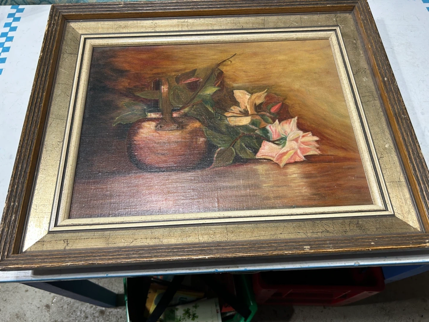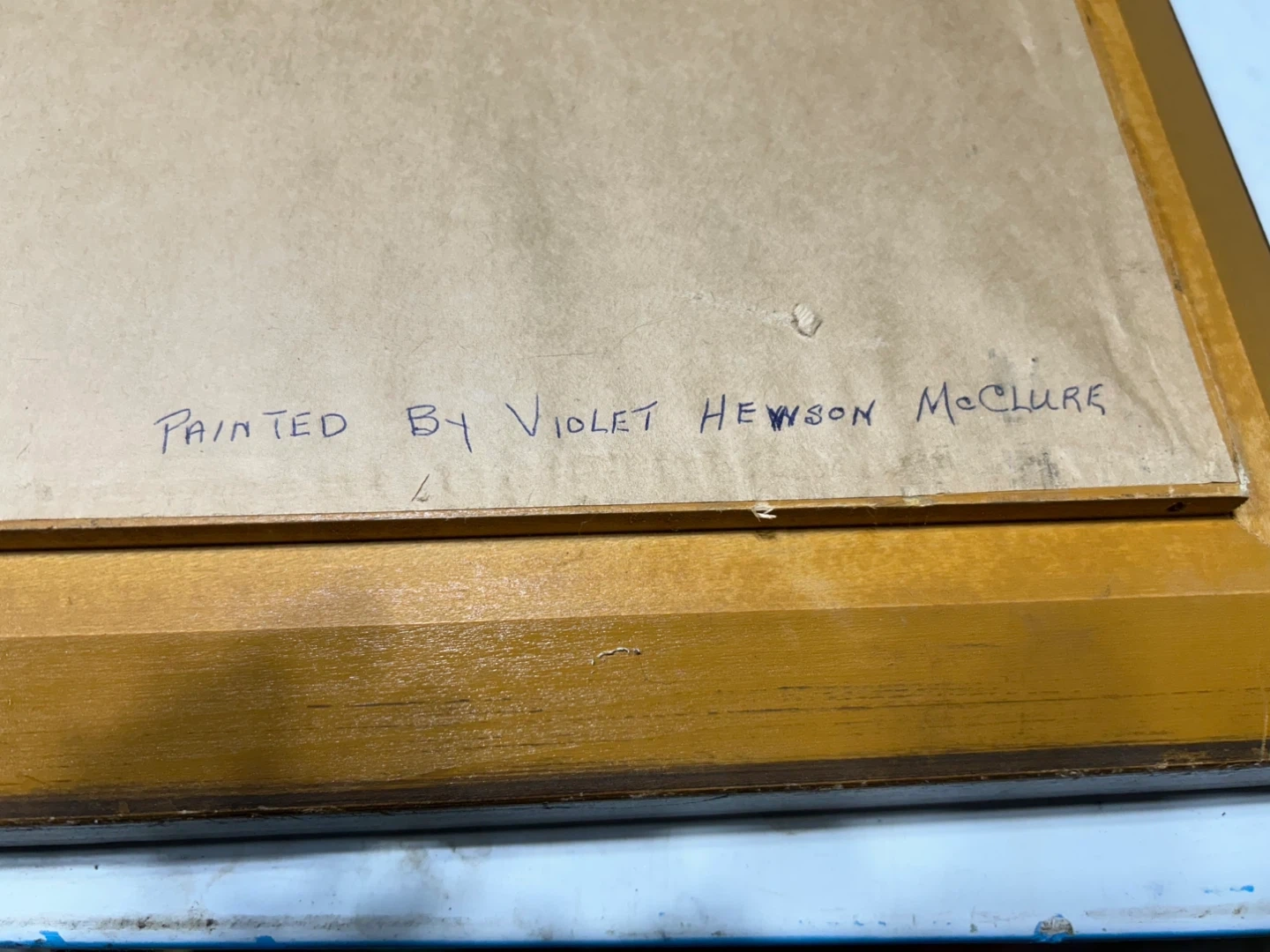 Framed painting by Violet Hewson McClure, dated 1977. Dimensions are 20x16. This custom framing by Simpsons may add to its appeal.